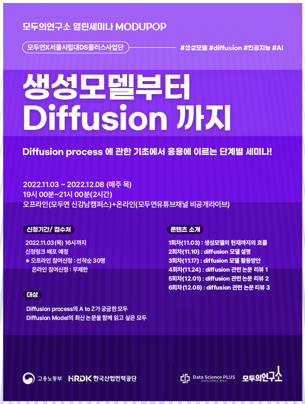 • 세미나 일시 : 11월 3일\~12월 9일 / 매주 목요일 / 저녁 7시\~9시 • 장소: 온오프믹스 ∨ 오프라인 : 모두의연구소 신강남캠퍼스 ∨ 온라인 : 모두연 유튜브채널 비공개라이브 • 인원 : 회차별 오프라인 30명 / 온라인 무제한 ∨ 신청이 많을 경우 조기마감될 수 있어요. ∨ 신청 후 사전 연락없이 불참하는경우 다음 세미나 신청에 불이익이 있을 수 있어요 • 대상 ∨ Diffusion process에 관해 기초에서 응용에 이르는 단계별 전문 지식 세미나를 기다렸던 모두 ∨ 생성모델의 A to Z가 궁금한 모두 ∨ Diffusion 모델의 최신 논문을 함께 읽고 싶은 모두