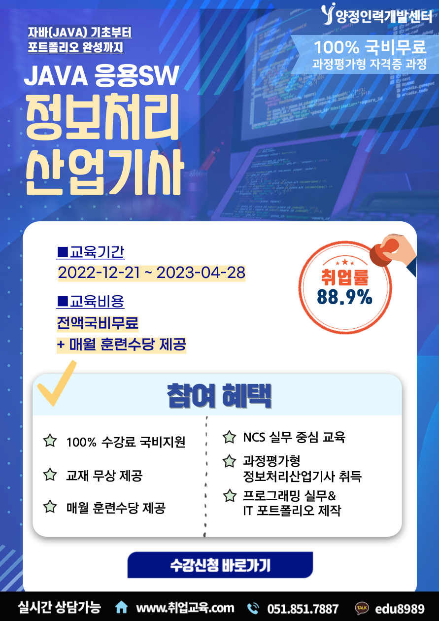 IT분야 취업 시 꼭 필요한 프로그래밍 언어 JAVA! JAVA기초부터 NCS 실무 중심 수업으로 과정평가형 국가공인 정보처리산업기사 자격증 취득하자! 취업용 IT 포트폴리오 제작까지 완벽대비! 전세계적으로 가장 많이 활용되는 JAVA를 중심으로 비전공자도 취업성공 할 수 있다! ★취업률 88.9% 달성(2021년 수료과정)★으로 우수한 취업률 전세계 IT 취업시장에서 가장 구인이 많은 JAVA 개발자로 #취업준비하면서 #전액국비무료와 #매월 훈련수당 제공, #국가공인자격증 취득까지\~