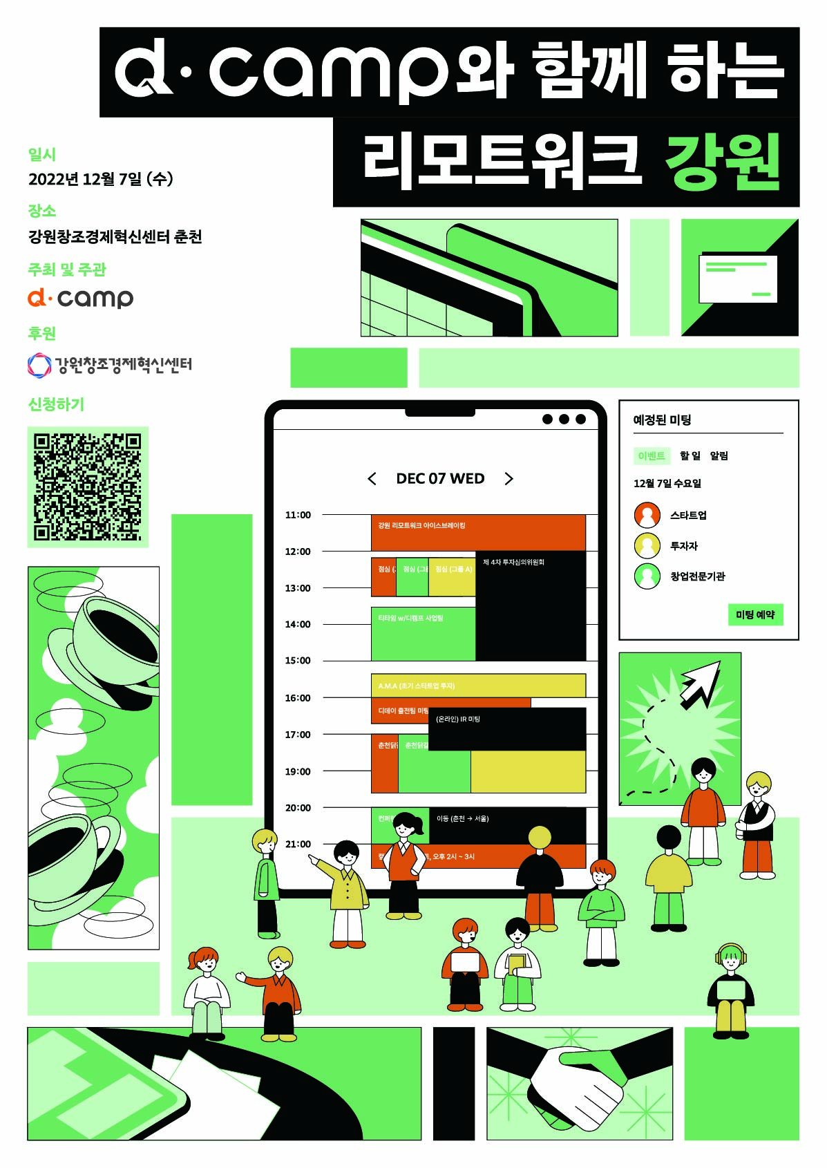d·camp와 함께 하는 리모트워크 (강원편) 일시: 2022년 12월 7일 (수) 10:00 \~ 20:00 장소: 강원창조경제혁신센터 (강원 춘천) 대상: VC·선배창업가·창업지원기관과 하루동안 함께 근무하며 네트워킹하고자 하는 스타트업 └ 본 프로그램은 사전 신청이 필요하며, 별도의 선발 과정을 거쳐 참석여부를 안내드릴 예정입니다. 최종 참석 안내를 받으신 분들만 입장 가능합니다. └ 기업 소재지에 관계없이 누구나 신청 가능합니다. └ 스타트업 외 VC, 창업지원기관 담당자도 신청 가능합니다! 풍성한 교류의 장이 될 수 있도록 많은 관심 부탁드려요! └ 신청링크: 바로가기 (모집마감: 12/6, 참가자 확정: 12/2\~) 디캠프 소개 은행권청년창업재단은 전국은행연합회 사원기관 19개 금융기관이 총 8,450억원을 출연하여 청년 창업 활성화를 목적으로 2012년에 설립한 민간창업지원기관입니다. 은행권청년창업재단은 2013년 대한민국 최초의 복합 창업 생태계 허브인 디캠프(d·camp)와, 2020년 세계 최대 규모의 프론트원(FRONT1)을 설립하여 스타트업 발굴-보육-투자에 이르는 전방위적 지원 체계를 구축하고 다양한 창업 지원 활동을 해오고 있습니다. 올해 4월 부산시, BNK부산은행과 업무협약을 통해 개소한 <디캠프 스타트업 라운지 @부산>을 시작으로, 지역 스타트업을 발굴하고 지원하기 위한 다양한 프로그램을 시도하고 있습니다.**