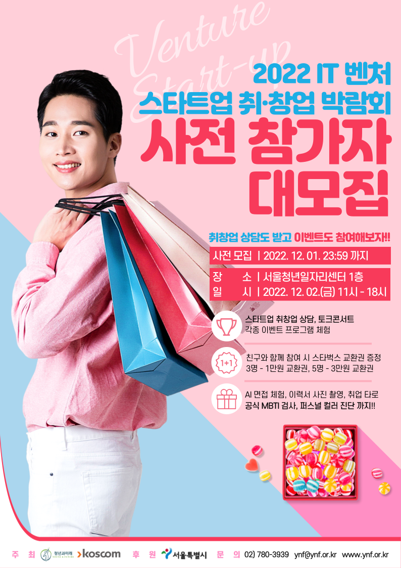 신청 : https://forms.gle/RKn62ZxNbirpzYMv8 <모집대상> 제한없음 (대한민국 청년 누구나!!) <모집기간> \~ 12월 01일 목요일 23:59 <박람회 일시> 12월 02일 금요일(11:00 - 18:00) <활동 내용> 박람회 참여, 취·창업 프로그램 체험 <추가 문의> ynf@ynf.or.kr 02-780-3939 (청년과미래) 청년과미래 홈페이지 www.ynf.or.kr