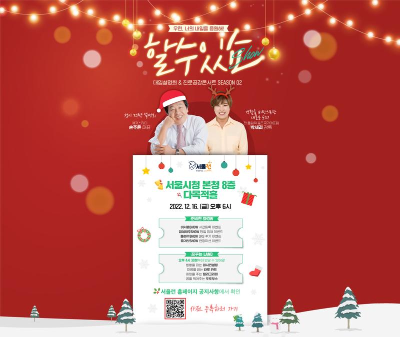 👉일정: 2022.12.16.(금) 오후 6시 - 꿈꾸는LAND : 4시 30분부터 참여 가능 👉장소: 서울시청 본청 8층 다목적홀 👉대상: 관심있는 분 누구나 👉비용: 전액 무료! 👉문의: 02-2133-9287, kimhy12@seoul.go.kr**