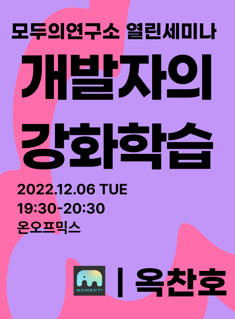개발자가 강화학습을 취미로 배운다면? • 세미나 일시 : 12월 6일 화 / 저녁 7시 30분\~8시 30분 • 연사 ∨ 옥찬호 (MOMENTI) • 장소: 온오프믹스 ∨ 오프라인 : 모두의연구소 신강남캠퍼스 ∨ 온라인 : 모두연 유튜브채널 비공개라이브 • 인원 : 오프라인 30명 / 온라인 무제한 ∨ 신청이 많을 경우 조기마감될 수 있어요. ∨ 신청 후 사전 연락없이 불참하는경우 다음 세미나 신청에 불이익이 있을 수 있어요 • 대상 ∨ 강화학습이 궁금하셨던 모두 ∨ 강화학습을 배워볼까 고민하는 모두 • 콘텐츠 ∨ 강화학습을 배우게 된 계기 ∨ 강화학습 환경 개발 ∨ RL 논문 리뷰 스터디 ∨ RL 강의 경험 ∨ Q&A ※본 세미나의 Q&A는 오프라인에서만 진행됩니다 :)