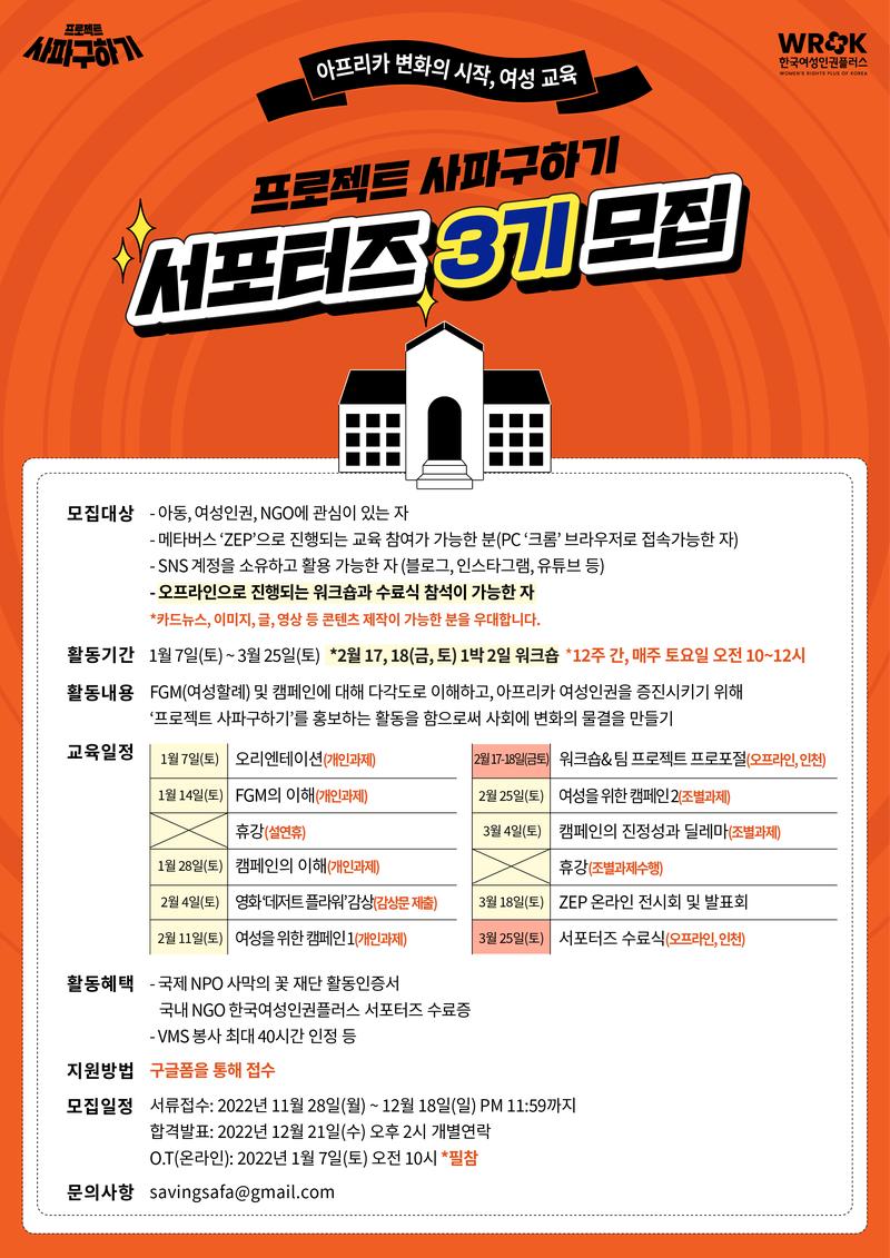 ■ 교육일정 매주 토요일 오전 10시\~12시(12주) *표시는 오프라인 참석 일정 1월 7일 - 오리엔테이션 1월 14일 - FGM의 이해 1월 21일(휴강) - 설 연휴 1월 28일 - 캠페인의 이해 2월 4일 - 영화 ‘데저트 플라워’ 감상 2월 11일 - 여성을 위한 캠페인1 2월 17\~18일 - 워크숍&팀 프로젝트 프로포절(인천청소년수련관)* 2월 25일 - 여성을 위한 캠페인2 3월 4일 - 캠페인의 진정성과 딜레마 3월 11일(휴강) - 조별과제수행 3월 18일 - 게더타운 온라인 전시회 및 발표회 3월 25일 - 서포터즈 수료식(인천 한국여성인권플러스)*
