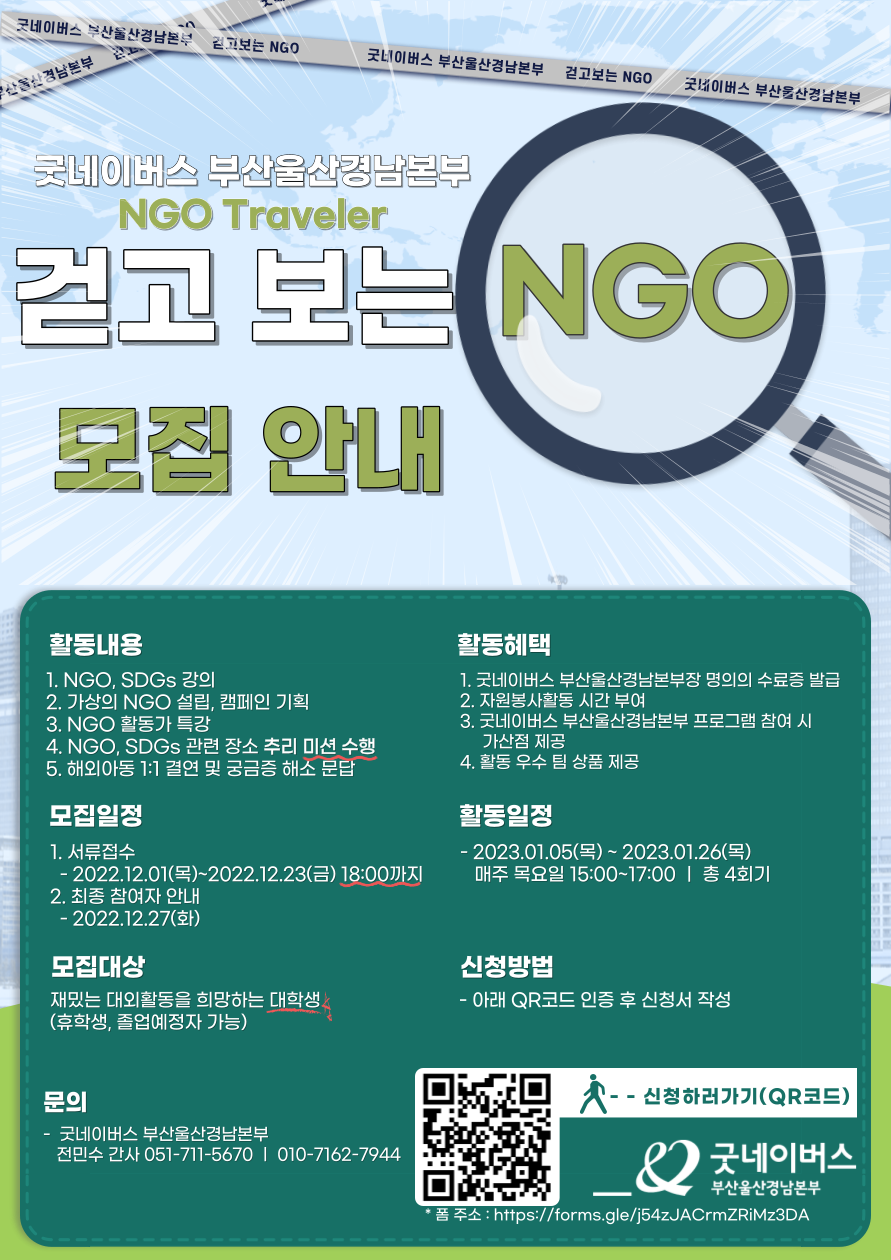 ● 지원자격 - NGO에 관심을 두고 해외아동 1:1 결연을 희망하는 대학생 누구나 ● 활동혜택 - 수료 시 굿네이버스 부산울산경남본부장 명의의 수료증 발급 - 캠페인 기획 및 활동 진행 시간 자원봉사활동 시간 인증 - 굿네이버스 부산울산경남본부 프로그램 참여자 선발 시 가산점 제공 - 활동 우수 팀 소정의 상품 제공 ● 지원방법 - 게시글 내 QR코드 혹은 링크(https://forms.gle/j54zJACrmZRiMz3DA) 접속 후 신청 - 굿네이버스 부산울산경남본부 홈페이지 내 폼 링크 접속 후 신청 ● 문의 - 굿네이버스 부산울산경남본부 전민수 간사(T. 051-711-5670)