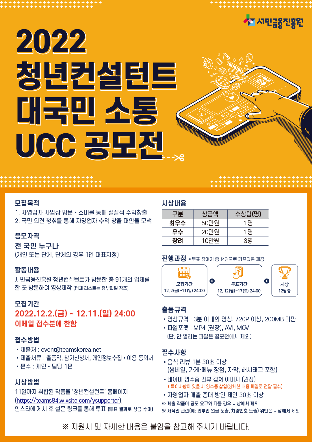 응모자격 : 전 국민 누구나(개인 또는 단체, 단체의 경우 1인 대표지정) 활동내용 : 서민금융진흥원 청년컨설턴트가 방문한 총 91개의 업체를 한 곳 방문하여 영상제작(업체 리스트는 첨부파일 참조) 모집기간 : 2022.12.2(금) \~ 12.11(일), 24:00 이메일 접수분에 한함 접수방법