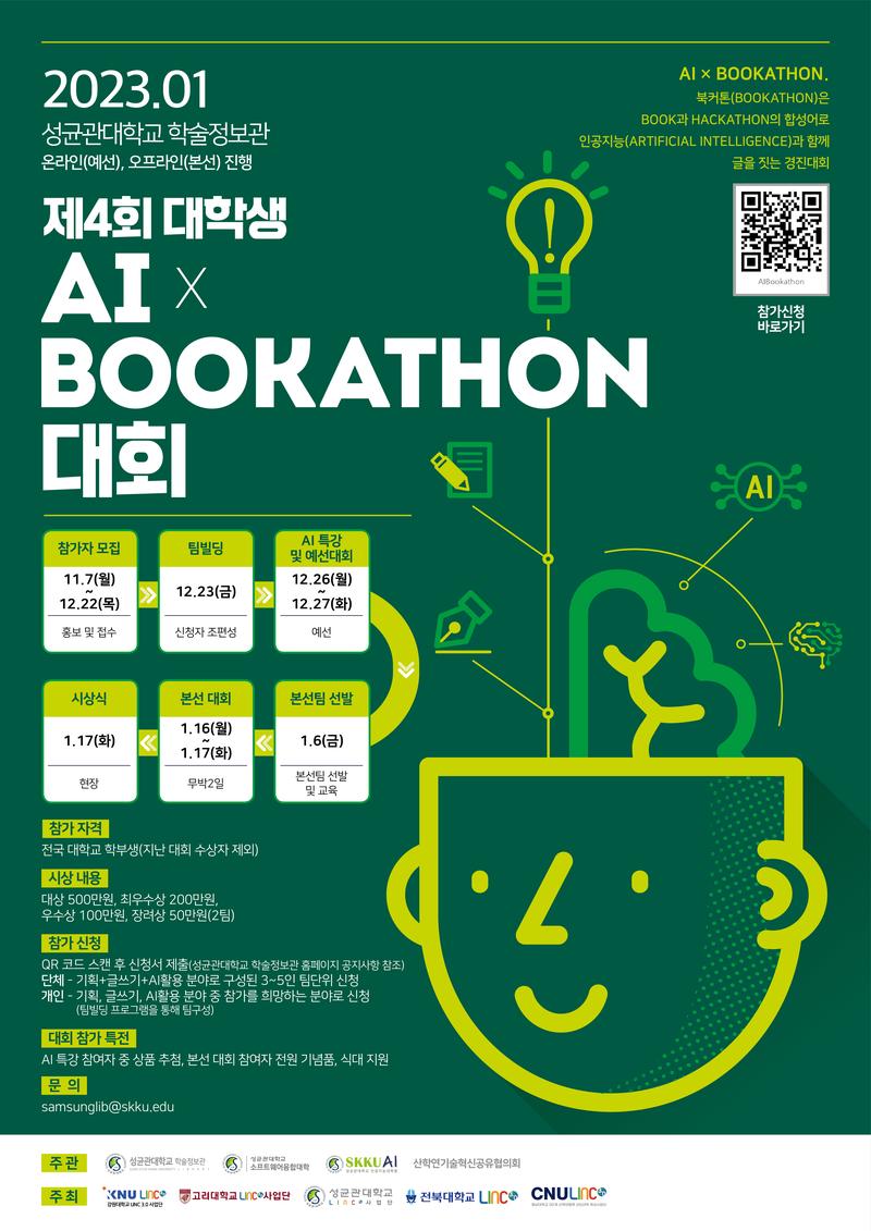 ● 행사개요 - 주최 : 성균관대학교 (학술정보관\, 소프트웨어융합대학\, 인공지능 대학원)\, 산학연기술혁신공유협의회 - 주관 : 강원대학교LINC 3.0사업단\, 고려대학교 LINC 3.0사업단\, 성균관대학교 LINC 3.0사업단\, 충남대학교 LINC 3.0사업단 - 공모기간 : 2022. 11. 07.(월) \~ 12. 22.(목) - 참가대상 : 전국 대학교 학부생(지난 대회 수상자 제외) - 참가 특전 : AI 특강 참여자 중 상품 추첨\, 본선 대회 참여자 전원 기념품\, 식대 지원 ● 공모내용 - 장르: 에세이 - 참가자격: 기획 + 글쓰기 + AI 활용 인원으로 팀 구성 - 평가기준: 문학적 가치\, AI 활용성 - 글쓰기 주제: 행사 당일 발표 - 언어: 한국어 - 대회형태: 온라인 ● 시상 - 대상 1팀(500만원)\, 최우수상 1팀(200만원)\, 우수상 1팀(100만원)\, 장려상 2팀(50만원) ● 일정 - 참가자 모집/접수 : 11.07(월)\~12.22(목) - 팀빌딩 : 12.23(금) - AI 특강 및 예선 대회 : 12.26(월)\~12.27(화) - 본선팀 선발 : 23.01.06(금) - 본선대회 : 23.01.16(월)\~01.17(화) - 시상식 : 01.17(화) ● 신청방법 - 포스터 속 QR 코드 스캔 후 신청서 제출 (성균관대학교 학술정보관 홈페이지 공지사항 참조) 단체 - 기획 + 글쓰기 + AI활용 분야로 구성된 3\~5인 팀단위 신청 개인 - 기획 + 글쓰기 + AI활용 분야 중 참가를 희망하는 분야로 신청