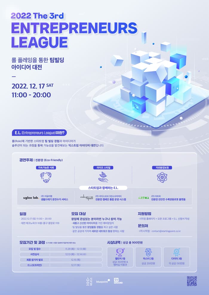 ● 공모개요 예비 창업자의 역량을 가시화하고 가능성을 탐색하기 위해 주식회사 시작점이 주최하는 아이디어 경진대회 「2022 The 3rd Entrepreneurs League : E.L. 롤 플레잉을 통한 팀빌딩, 아이디어 대전」 신청자 모집을 공고합니다.