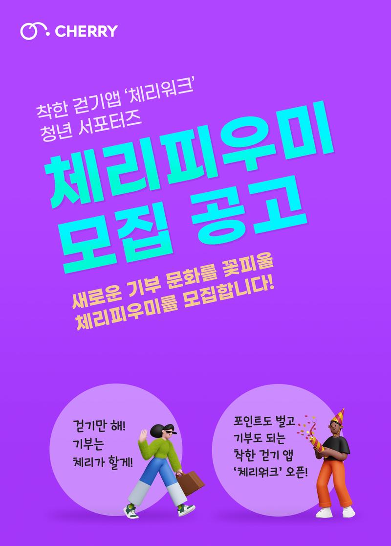 착한 걷기앱 체리워크 서포터즈, '체리피우미' 모집 공고 국내 최초 블록체인 기반 기부 플랫폼 'CHERRY'의 신규 서비스 체리워크와 함께할 '체리 피우미'를 모집합니다. 사회공헌, IT, 블록체인, 마케팅에 관심 있는 분들의 많은 지원을 기다립니다. ■ 모집 인원: 10명 내외 ■ 활동 기간: 2022년 12월 \~ 2023년 3월, 약 3개월 ■ 주요 활동: 체리 신규 서비스 ‘체리워크’ 체험 및 피드백, 체리 브랜드 및 서비스(체리워크) 홍보, 체리워크 체험에 대한 SNS 콘텐츠 업로드 등 ■ 지원 자격 및 우대 사항: - CHERRY와 함께 기분 좋은 기부 문화를 사회에 나누려는 비전을 공유한 만 14세 이상\, 만 30세 이하 청년 - 사회공헌\, 마케팅\, 블록체인\, IT 분야 관심자 - 글\, 그림\, 사진\, 영상 제작 및 프로모션 활동 기획 등 스킬 보유자 - CHERRY 앱 가입\, 공식 페이스북/인스타그램 팔로우/좋아요 필수 ■ 참가자 혜택: - 매월 활동비 지급 - 수료증 발급 - 우수 활동자 대상 장학금 총 50만 원 지급 ■ 지원 안내 - 접수 기간: 2022년 12월 05일\~11일\, 7일 간 - 접수 방법: 지원서 작성 링크로 접속해 기재(https://forms.gle/G82xw35WGmy1js8a8) - 합격자 발표: 2022년 12월 14일\, 공식 SNS 통해 발표 ■ 문의처: 이포넷 체리 기획팀 신민규 대리 (mingyu.shin@e4net.net) * 선발 평가 내용 등에 대한 문의는 삼가 바랍니다.