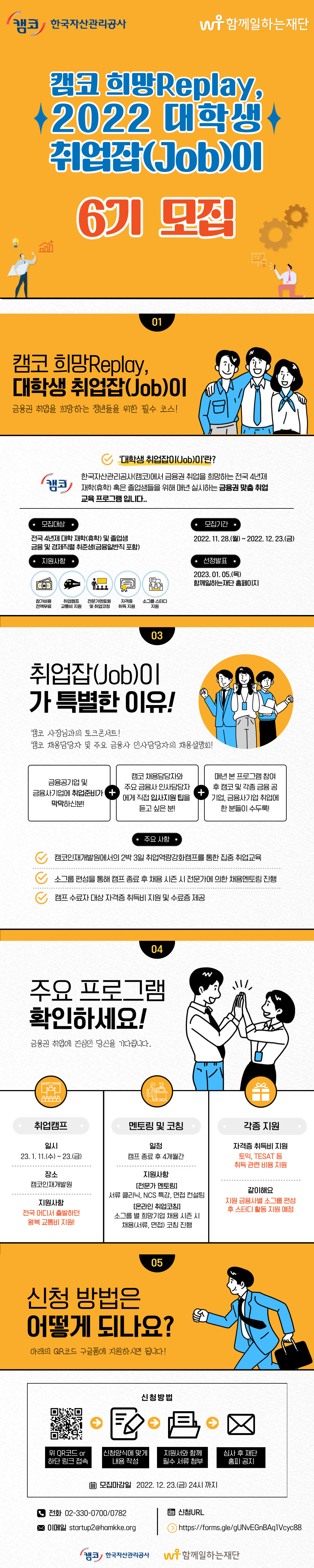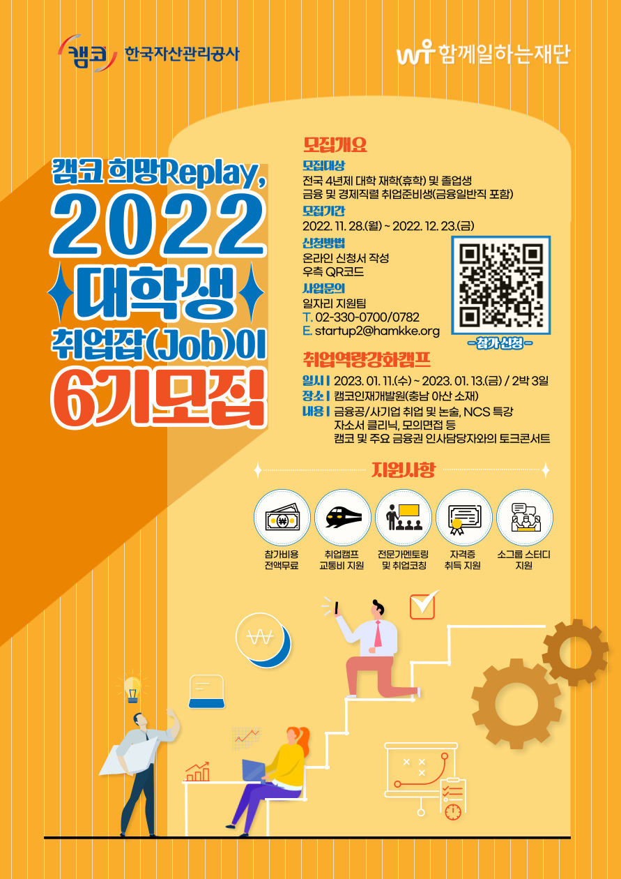 함께 일하는 재단과 한국자산관리공사는 청년의 취업 준비 비용 감소 및 역량강화를 통한 실업해소에 기여하기 위하여 2022 대학생 취업잡(Job)이 프로그램을 진행합니다. 아래 내용 확인하시고 많은 참여 부탁드립니다. ⏩ 모집개요 - 전국 4년제 대학 재학(휴학) 및 졸업생 - 금융 및 경제직렬 취업준비생(금융일반직 포함) ⏩ 모집기간 - 2022. 11. 28. (월) \~ 2022. 12. 23. (금), 24시까지 ⏩ 모집인원 - 100명 # 저소득층 우대: 기초생활수급자, 차상위계층, 한국장학재단 국가장학금 I유형 1\~4분위 해당자 ⏩ 주요 프로그램 1) 취업역량강화캠프(필수 참가/미참여 시 프로그램 참여 불가) - 일시: 23. 01. 11.(수) \~ 23. 01. 13.(금)/ 2박 3일 - 장소: 캠코인재개발원(충남 아산 소재) - 내용: 금융공기업/사기업 취업 및 논술, NCS특강 l 자소서 클리닉, 모의면접 등 l 캠코 및 주요 금융권 인사담당자와의 토크콘서트 2) 전문가 멘토링 - 일정: 23. 01. 16.(월) \~ 23. 03. 17.(금)/약 2개월간 조별 3회 탄력 진행 - 내용: 1회차 입사서류 클리닉/2회차 NCS 특강/3회차 면접 컨설팅 3) 온라인 취업코칭 - 일정: 23. 01. 16.(월) \~ 23. 05. 12.(금)/약 4개월간 조별 5회 수시 진행 - 내용: 금융권 공채 시즌 맞춤 서류 및 면접 멘토링 ⏩ 참가자 지원사항 및 혜택 - 참가비용 전액 무료 - 취업캠프 교통비 지원 - 캠프 후 전문가 멘토링 및 온라인 취업코칭 - 자격증(토익 및 TESAT 등) 취득 지원 - 소그룹 스터디 지원 ⏩ 선정과정 - 서류접수 -> 서류심사 -> 서류발표 -> 자기소개서 제출 ⏩ 선정발표 - 2023년 01월 05일(목) 이내 재단 홈페이지 공지 발표 ⏩ 제출서류 안내 1) 필수제출 - 재학(휴학), 졸업증명서 사본(증명서는 jpg 또는 PDF 형태로 업로드) # 구글폼 내 업로드 원칙 (https://forms.gle/aKiAfCVt6zjippdSA) (다만, 증명서 출력 방식을 이메일 전송으로 선택할 경우, heosh@incruit.com 으로 전송) 2) 선택제출(해당자만 제출/참여자 선정 시 우대) - 우대자 증명서류: 기초생활수급자, 차상위계층, 한국장학재단 국가장학금 I유형 1\~4분위 해당자 [참고] 증명서류 발급 안내 # 기초생활수급자 - 온라인: 정부24 www.gov.kr 서비스 > 신청, 조회, 발급 > '국민기초생활수급자증명' 검색 > 신청 - 오프라인: 가까운 주민센터 방문 # 차상위계층 - 온라인: 국민건강보험공단 www.nhis.or.kr 민원신청 > 개인민원 > 자격 > '자격확인서 발급' - 오프라인: 가까운 국민건강보험공단 방문 # 국가장학금 I유형 - 온라인: 한국장학재단 www.kosaf.go.kr 1) 장학금 > 소득구간 > 나의 소득구간확인 2) 장학금 > 증명서발급 > 소득구간통지서발급 * 신규 학기 장학금 신청 기간일 경우, 고객센터 > 질문있어요 > 온라인상담 > 신청하기 > 지난 학기 소득분위 확인서 발급 신청 ⏩ 기타 문의사항 - 일자리지원팀 T. 02-330-0700/0782 E. startup2@hamkke.org