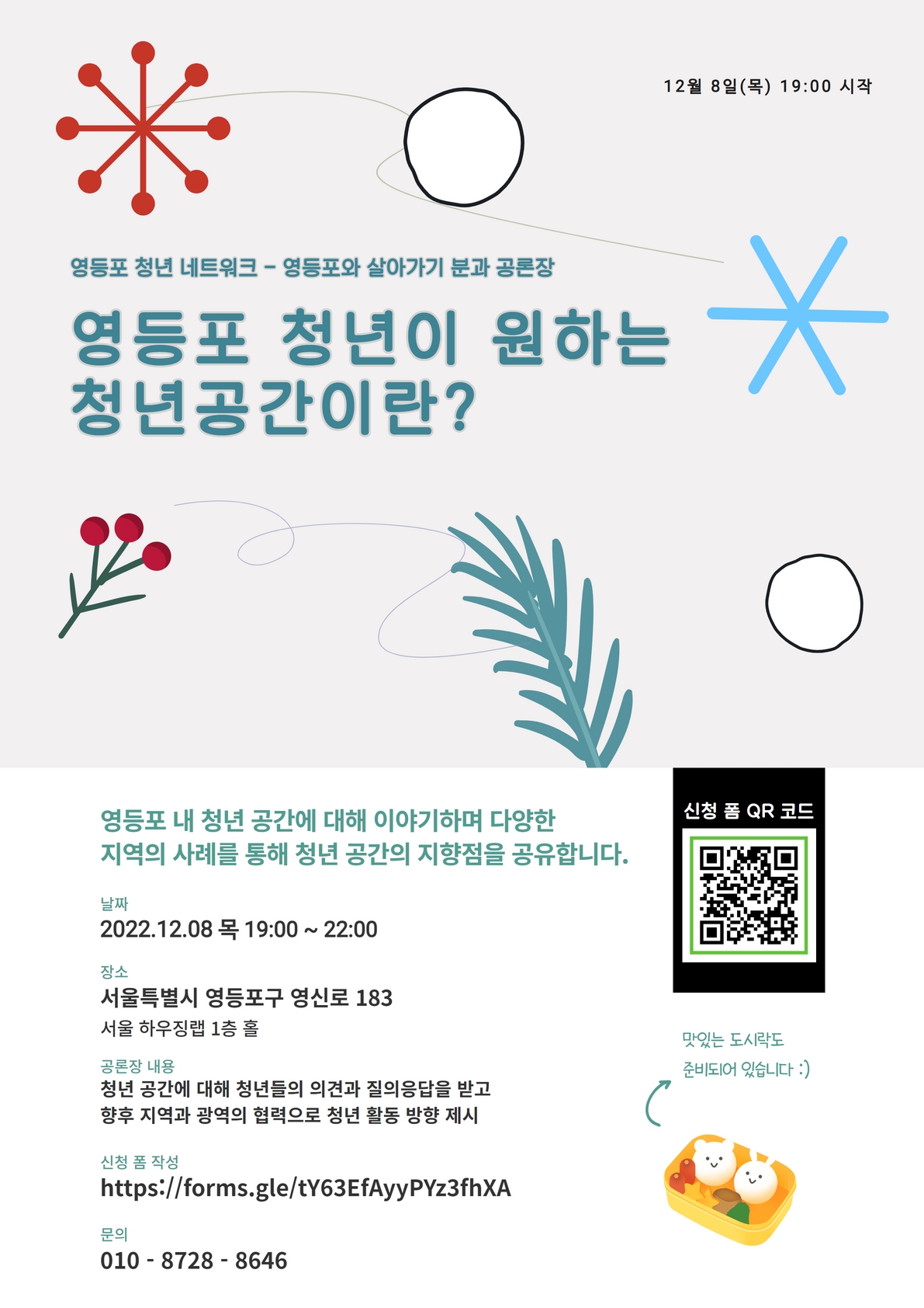 안녕하세요 영등포 청년 네트워크입니다. 이번주 목요일날 저희 네트워크에서 영등포에서 공론장을 개최해 공유합니다. 일시 : 12월 8일(목) 19:00\~22:00 장소 : 서울특별시 영등포구 영신로 183 서울 하우징랩 1층 지금 준비중인 공론장에서 영등포 내 청년 공간, 타지역의 청년공간에 대해 이야기하며 다양한 지역의 사례를 통해 청년 공간의 지향점을 얘기하는 공론장입니다 :) 도시락도 준비되어 있으니 편하게 참석 부탁드려요😊😊 공론장 신청 링크 : https://forms.gle/tY63EfAyyPYz3fhXA 문의 : 운영사무국) 010-8728-8646 청년 활동에 관심 많으신 분들의 신청 기다리고 있겠습니다. :)