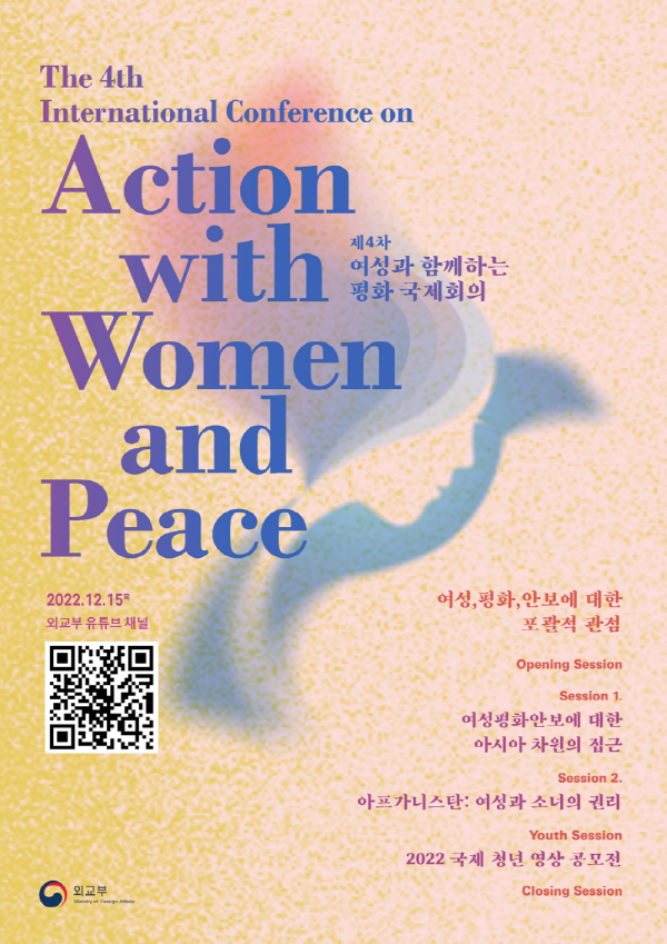 [제4차 여성과 함께하는 평화 국제회의]에 여러분을 초대합니다. - 일시 : 2022년 12월 15일 오전 10시부터 오후 5시까지 - 주제 : 여성·평화·안보(Women, Peace, and Security)에 대한 포괄적 관점 - 주최 : 외교부 ** 외교부 유튜브 채널 Live-streaming** ** 사전등록을 하시면 행사 당일 시청 가능한 URL과 관련 자료를 보내드립니다. >>> https://2022awp.or.kr/ko/registration/ **연사 소개는 첨부된 프로그램 파일을 참고해주세요 ▣ 개회식 2022년은 ‘불안정과 불안의 연장선상 -영구위기(permacrisis)’라는 단어로 규정되었습니다. 아시아, 아프리카 및 유럽의 전쟁 상황은 지난 1년 동안 꾸준히 악화되고 있으며, 전쟁으로부터 고통받는 여성과 소녀들에게는 지속적으로 심각한 영향을 미치고 있습니다. 개회사에서는 ‘여성과 함께하는 평화’ 이니셔티브가 전 세계 여성, 평화, 안보 분야 논의를 이끌어가도록 의제 및 방향성을 설정하고자 합니다.