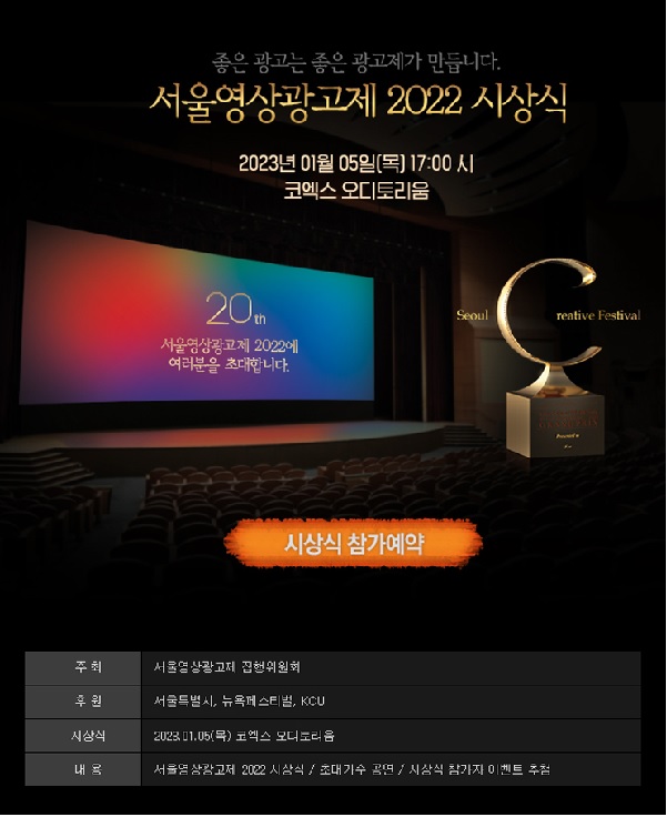 ◈‘서울영상광고제 2022 시상식' 에 여러분을 초대합니다 1년에 단 한 번, 단 하루만 개최되는 서울영상광고제! 올해 가장 사랑을 받았던 수상작을 발표합니다! 오프라인 시상식에 참석하고, 찐\~\~한 감동을 느껴보세요. ◈일 시 2023년 1월 5일(목) 17:00 ◈장 소 코엑스 오디토리움 ◈내 용 - 서울영상광고제 2022 시상식 - 초대가수 공연 - 시상식 참가자 이벤트 추첨 ◈접수기간 2022. 12. 01(목) \~ 2023. 01. 05(목) ◈접수방법 서울영상광고제 홈페이지 사전 접수 https://www.tvcf.co.kr/TvcfAward/Main/default.asp ◈기타사항 ※ 코엑스 오디토리움 규모로 인해, 선 예약순으로 모집 마감하는 점 미리 양해 부탁 드립니다. ※ 유료 참석자 전원에게 수상집, 노트, 수상 광고주 후원 선물 및 다양한 경품 등 5만원 이상의 혜택을 드립니다. 네티즌과 광고인의 소중한 만남으로 이루어지는 서울영상광고제 2022에서 만나요\~ ◈주최 서울영상광고제 ◈후원 서울특별시, 뉴욕페스티벌, 한국광고영상제작사협회 ◈문의 - 이메일 : award@tvcf.co.kr - 전 화 : 02-3447-0101