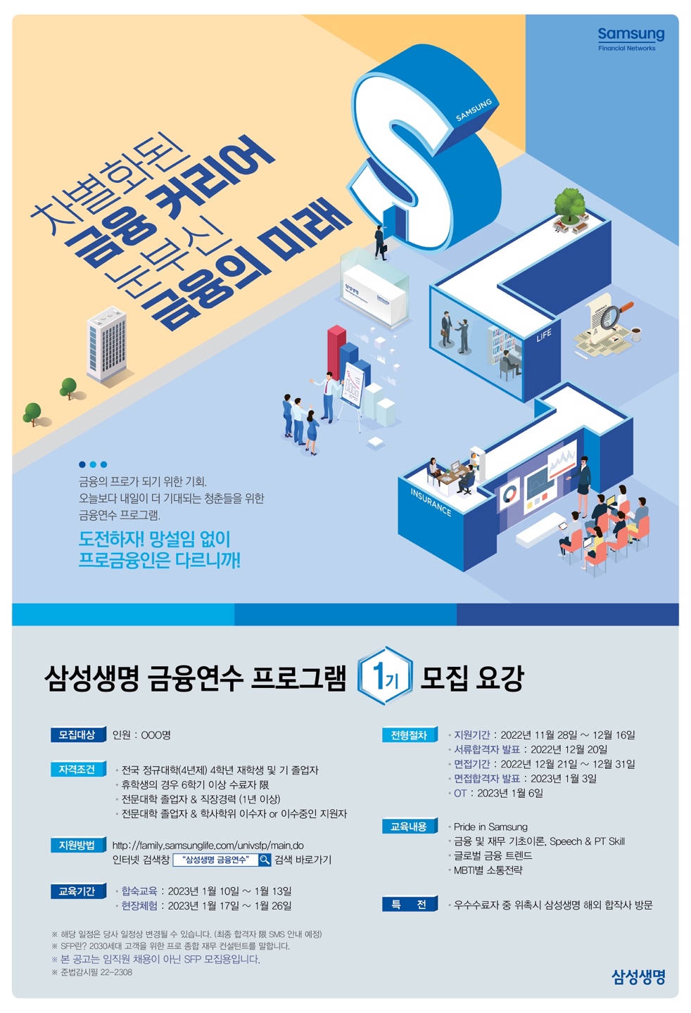 ■ 교육기간 : 합숙교육 : 2023년 1월 10일 \~ 13일(삼성생명 연수원) 현장교육 : 2023년 1월 17일 \~ 26일(삼성생명 대치타워)
