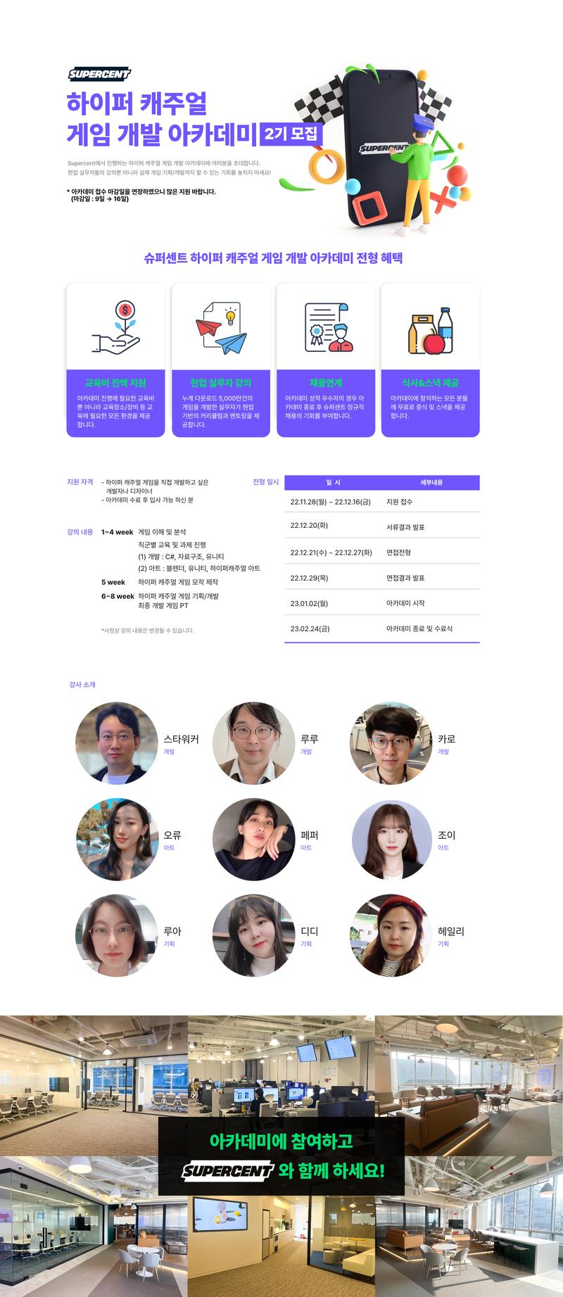 [지원자격] • 하이퍼 캐주얼 게임을 직접 개발하고 싶은 개발자나 디자이너 • 아카데미 수료 후 입사 가능하신 분 [강의 내용] • 1\~4주차 - 하이퍼 캐주얼 게임 이해 및 분석 직군별 교육 및 과제 진행 - 개발 : C#\, 자료구조\, 유니티 - 아트 : 블렌더\, 유니티\, 하이퍼 캐주얼 아트 • 5주차 - 하이퍼 캐주얼 게임 모작 제작 • 6\~8주차 - 하이퍼 캐주얼 게임 기획 / 개발 / PT [전형 일정] • 지원접수 - 22년 11월 28일(월) \~ 22년 12월 16일(금) • 서류결과 발표 - 22년 12월 20일(화) • 면접결과 발표 - 22년 12월 29일(목) • 아카데미 시작 - 23년 1월 2일(월) [전형혜택] • 채용연계 - 성적 우수 교육생은 정규직 채용 기회 부여 • 멘토링 - 현업 개발자/아티스트의 실시간 멘토링 • 교육비 전액 지원 - 아카데미 진행과 관련된 모든 교육/장비 비용 지원 • 식사&스낵 제공 - 회사비용으로 이용 가능 [지원방법] • 슈퍼센트 하이퍼 캐주얼 게임 개발 아카데미 홈페이지 내 신청서 작성 (https://supercent.io/academy) [유의사항] • 접수 시 정확한 개인정보를 입력해주세요. 만약, 잘못 기입하거나 일치하지 않을 경우 지원/활동이 취소될 수 있습니다. • 개인정보 수집·이용에 동의한 개인들을 대상으로 진행됩니다. 제출 이 후 개인정보 수집·이용 동의 철회 시제외되오니 참고 바랍니다. • 일정 및 강의 내용은 아카데미 진행 상황에 따라 변동될 수 있습니다. [문의사항] • recruit@supercent.io로 문의 부탁드립니다.