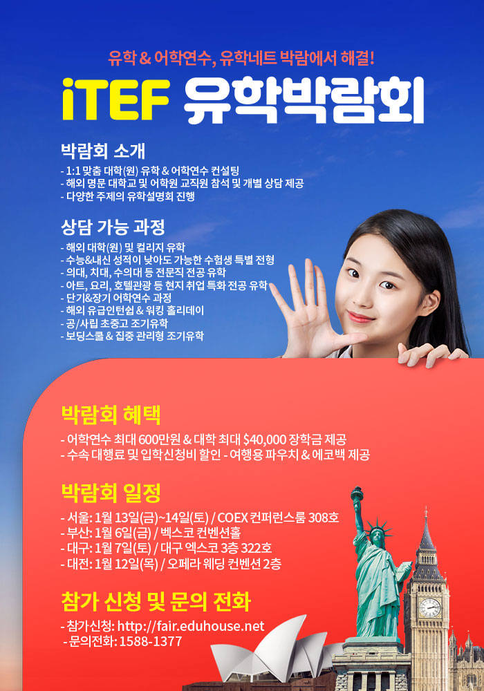 🔹 2023 iTEF 유학박람회에서는 - 1:1 맞춤 대학(원) 유학 & 어학연수 컨설팅 - 국가 및 도시 선정\, 프로그램 안내\, 학비 등 필수 정보 제공 - 해외 명문 학교 교직원 참석 및 개별 상담 제공 - 다양한 주제의 유학설명회 진행