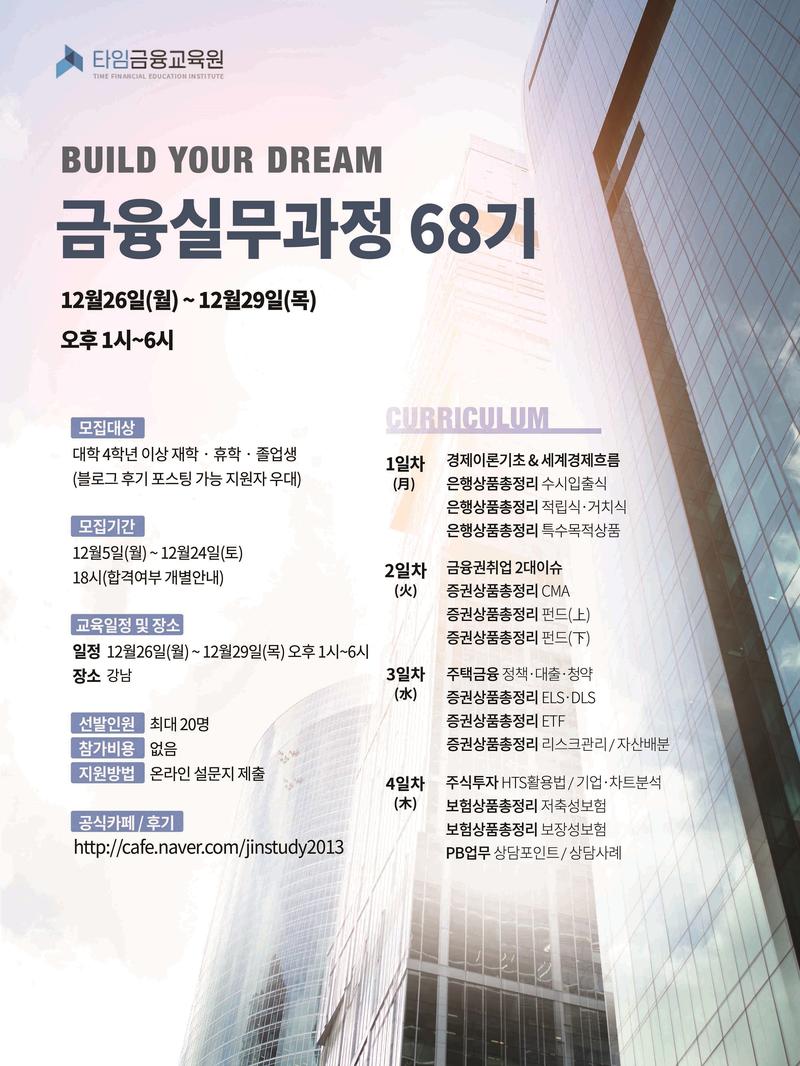 ▶ 모집개요 은행/증권/보험 직무별 실무, 자소서, 면접 컨셉 등 하반기 채용 대비 "단기간 Jump up 금융교육" 입니다. ▶ 신청기간 및 일정 - 신청기간 : 12월5일 \~ 12월24일 18:00 - 합격자 발표 : 합격여부 개별안내 - 교육기간 : 12월26일 \~ 12월29일 오후 1시\~6시 - 장소 : 타임금융교육원 연수실 (선릉역 5번 출구\, 테헤란로 311 아남타워) ▶ 참가비용 - 없음 ▶ 특전 - 수료증 발급 - 금융회사 입사 시\, 본 교육원 파트너 강사로 대학 출강 가능 ▶ 지원대상 - 대학 4학년 이상 재학 / 휴학 / 졸업생 - 블로그 후기 포스팅 가능 지원자 우대 ▶ 지원방법 - 온라인지원 : https://goo.gl/forms/uY8ffyJ1dJongodA3 ▶ 교육후기 - 공식카페 : https://cafe.naver.com/jinstudy2013 ▶ 문의처 - 이의진 강사 - TEL : 010-9510-0840 - E-MAIL : euijin0810@gmail.com