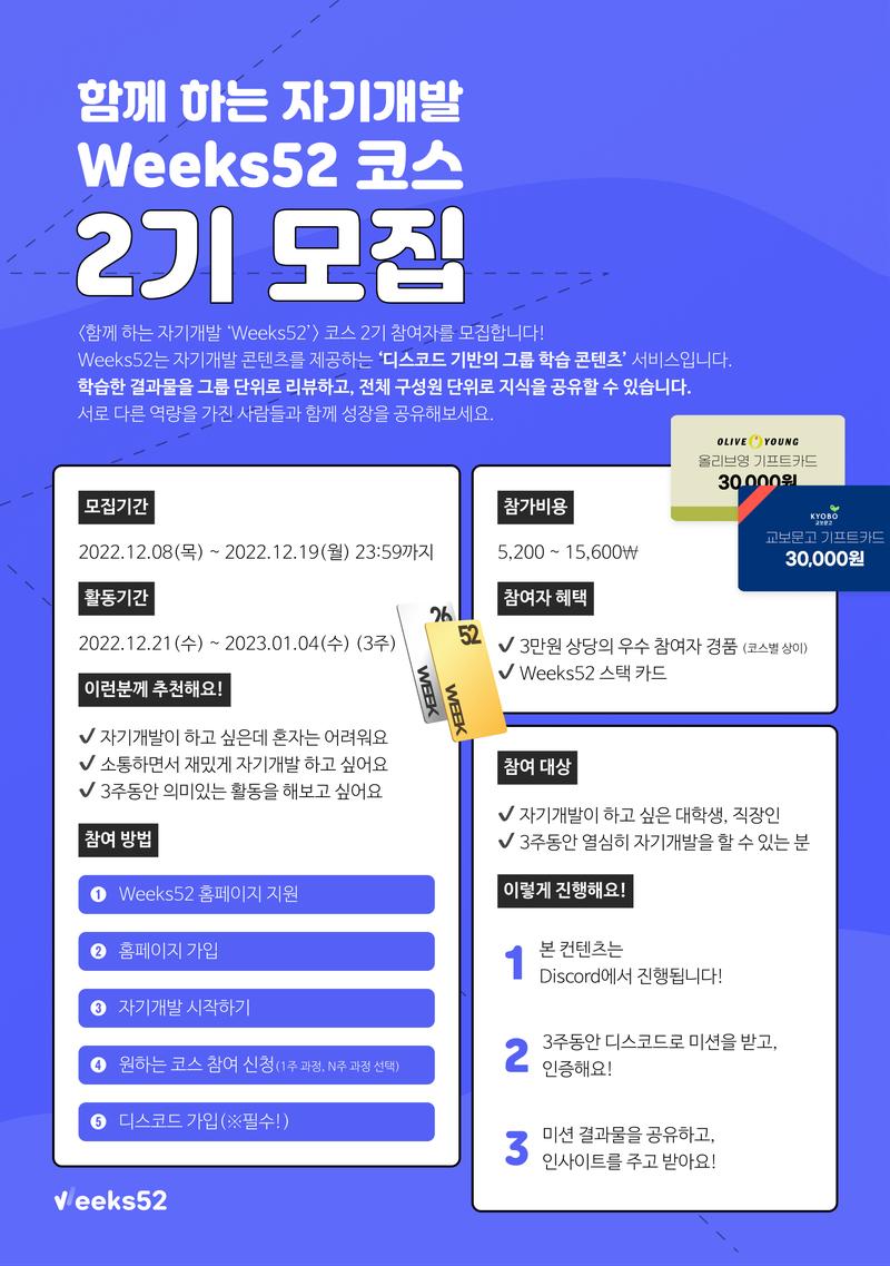 📝 모집 개요 <함께 하는 자기개발 ‘Weeks52’> 코스 2기 참여자를 모집합니다! Weeks52는 자기개발 콘텐츠를 제공하는 ‘디스코드 기반의 그룹 학습 콘텐츠’ 서비스입니다. 학습한 결과물을 그룹 단위로 리뷰하고, 전체 구성원 단위로 지식을 공유할 수 있습니다. 서로 다른 역량을 가진 사람들과 함께 성장을 공유해보세요.