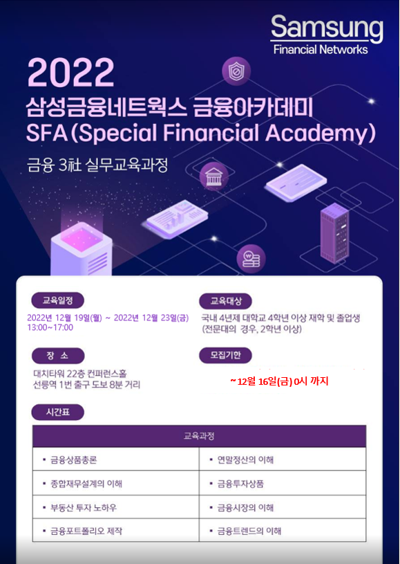 삼성생명 SFP사업부에서 5일간 진행되는 금융 아카데미를 개최합니다. 교육의 메카 삼성에서 취업을 앞둔 대학생들의 희망찬 비전을 위해 다양한 지식과 경험의 장을 만들어 드립니다. 금융영업, 금융업 취업을 희망하는 대학생, 졸업생들의 많은 관심과 참여 바랍니다.