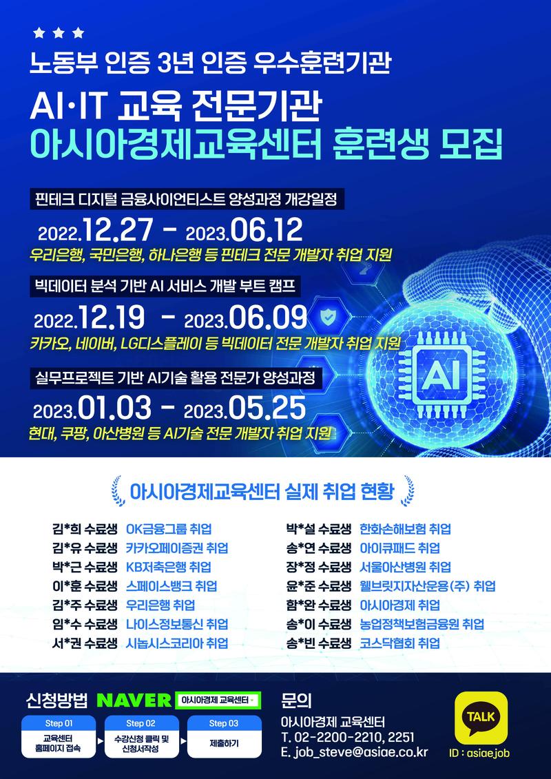 국비지원 교육과정 “K-Digital training”과 아시아경제 교육센터 취업지원시스템, 취업현황, 수강후기 등 더 많은 정보를 원한다면 아래 홈페이지에 방문해주세요.