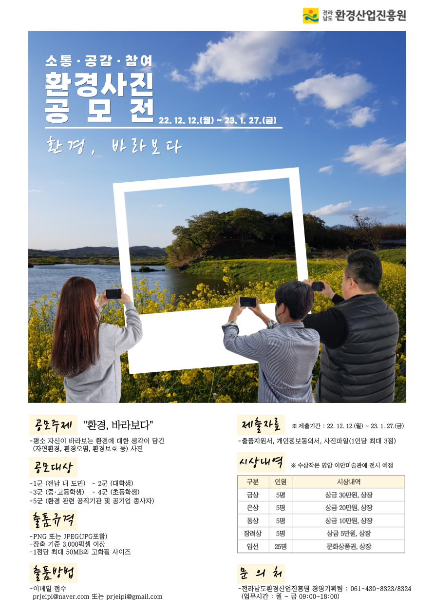 ○ 공모주제 “환경, 바라보다.” - 환경과 관련된 사진(자연환경, 환경오염, 환경보호 등 환경에 관련된 주제면 출품 가능) - 평소 자신이 바라보는 환경에 대한 생각이 담긴(자연환경, 환경오염, 환경보호 등) 사진 ○ 공모대상 - 전라남도에 거주 중인 도민 누구나 ○ 공모기간 - `22년 12월 12일(월) \~ `23년 1월 27일(금) / 47일간 ○ 접수방법 - 이메일 접수(prjeipi@naver.com 또는 prjeipi@gmail.com) ○ 출품형식 - 디지털 사진(장축 기준 3,000 pixel 이상) 1인 최대 3장 ○ 공모분야 : 5개 부문 - 일반부 : 전라남도 도민이면 누구나 참여 가능 - 대학생 : 현재 전남 소재 대학교나 그에 해당하는 학교를 재학 중 이거나 졸업 예정인 자 - 중·고등학생 : 현재 전남 소재 중학교나 그에 해당하는 학교를 재학 중 이거나 졸업 예정인 자 - 초등학생 : 현재 전남 소재 초등학교나 그에 해당하는 학교를 재학 중 이거나 졸업 예정인 자 - 환경 관련 공공기관 및 공기업 종사자 : 전남 소재 공공기관 및 유관단체에 근무중인 자 혹은 환경관련 업체 종사자 ○ 시상 및 전시기간 - 23. 2. 9.(목) \~ 2. 13.(월) / 전라남도 영암 이안미술관 전시 예정 ※ 시상 및 전시 관련 세부 사항은 결과 발표 시 공지 ○ 시상규모 : 총 45점 / 총상금 350만원 - 금상(5명, 각 30만원) / 은상(5명, 각 20만원) / 동상(5명, 각 10만원) / 장려상(5명, 각 5만원) / 입선작(25명, 1만원 상당의 문화상품권) - 장려상 이상의 수상자는 영암이안미술관에서 상장 수여 예정입니다. - 금상, 은상, 동상, 장려상 작품은 이안미술관에 전시됩니다. - 입선작 일부는 전시되며 추후 변동될 수 있습니다. - 수상자 전원은 전라남도환경산업진흥원장 상장을 수여합니다. ※ 제출서류 및 자세한 사항은 전라남도환경산업진흥원 홈페이지의 공지사항을 참고 바랍니다. http://www.jeipi.or.kr/rainboard/rain.php?rBoard=notice&wr_id=257