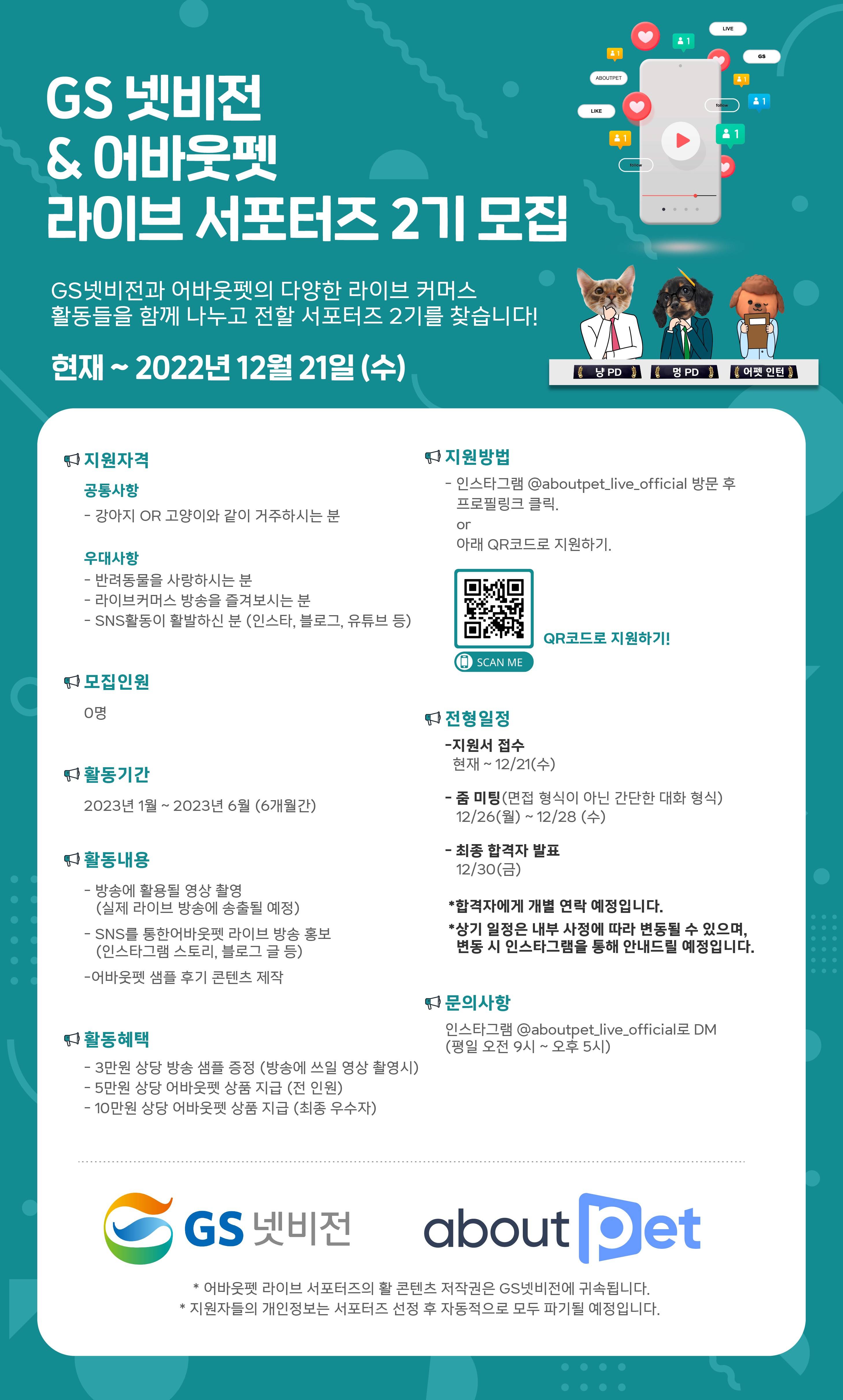 ※ 합격자에 의해 개별 연락 예정입니다. ※ 일정은 내부사정에 의해 변동될 수 있습니다. ※ 해당 서포터즈 활동을 통해 발생된 결과물의 저작권은 모두 GS넷비전과 어바웃펫에 귀속됩니다. ※ 서포터즈 활동이 불성실하게 임할 경우, 활동 혜택은 지급되지 않으며, 서포터즈 활동이 중단될 수 있습니다.