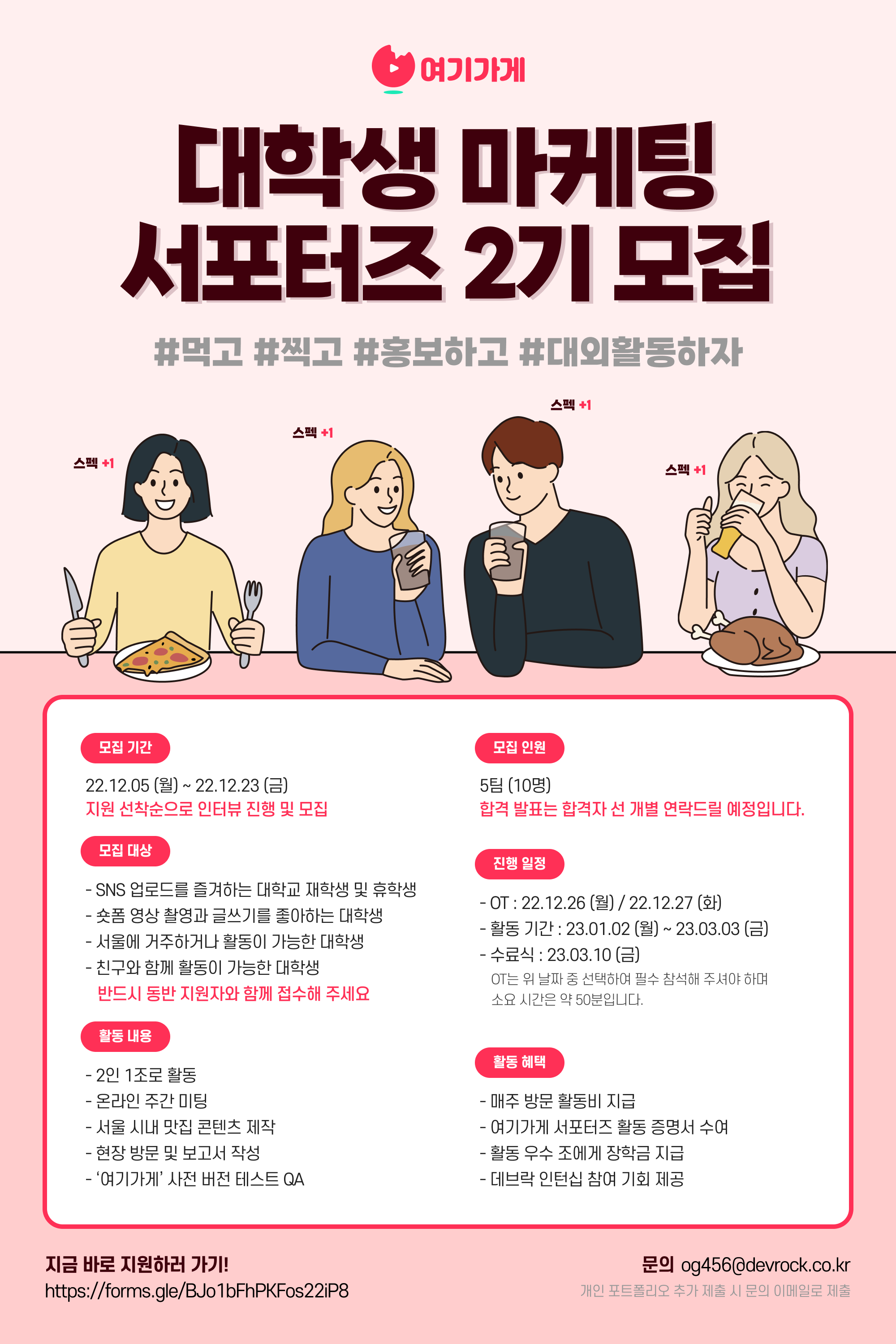 📢 상세 내용 가게를 직접 알리고 가게 리뷰를 숏 영상으로 보여주는 숏 폼 비디오 플랫폼 ‘여기가게’에서 대학생 서포터즈 2기를 모집합니다!