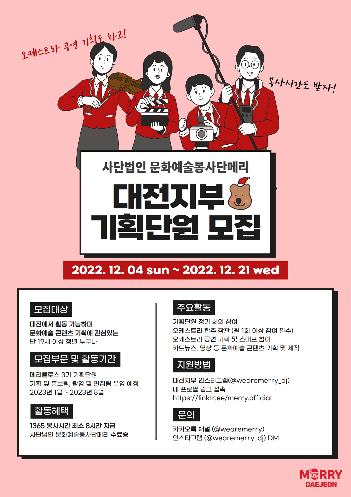 🎅🏻 지원방법 : https://linktr.ee/merry.official 접속 후 "대전지부 기획단원 3기 모집"클릭!