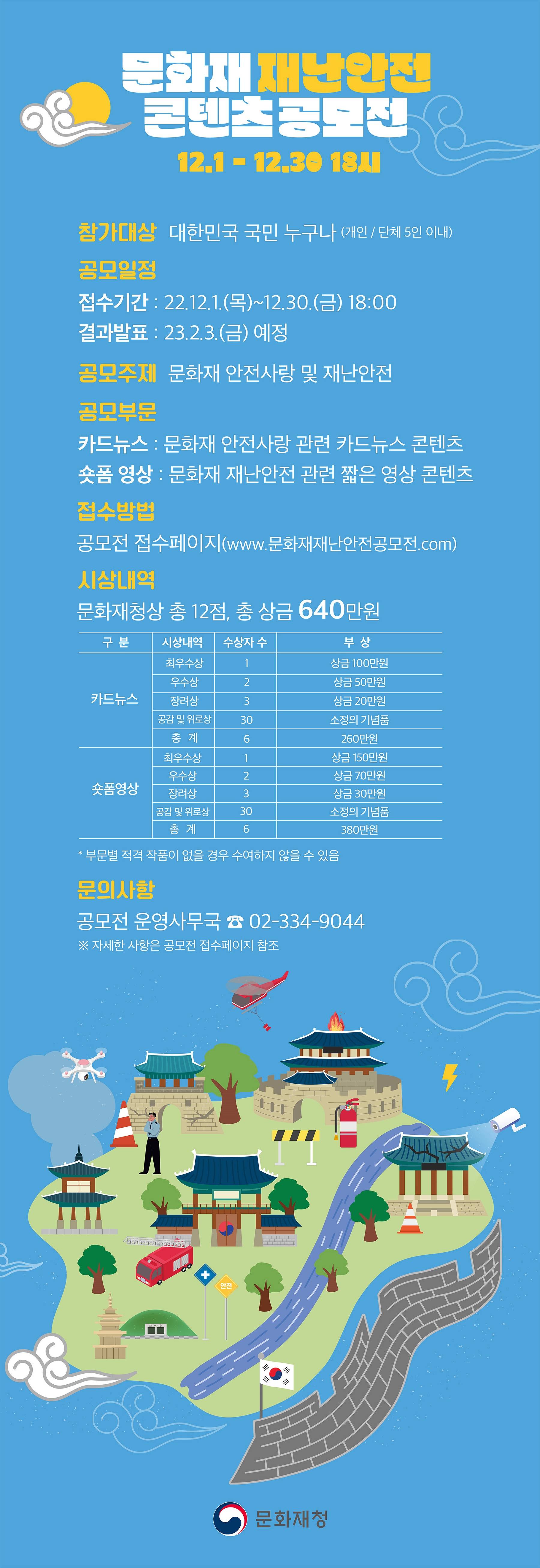 문화재 재단안전 콘텐츠공모전 [공모일정] 접수기간: 22년 12월 1일 \~ 12월 30일 결과발표: 23년 2월 3일 예정