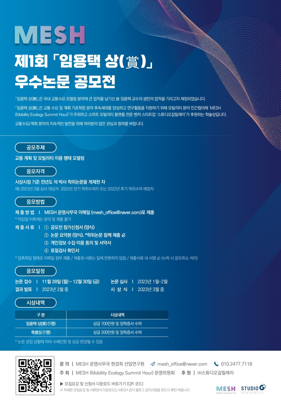 빌리티 분야 민간협의체 ‘MESH(Mobility Ecology Summit Hour)’는 교통수요 및 교통계획 기초학문 분야의 후속세대를 양성하고 연구활동을 지원함으로써 교통수요 및 계획 분야의 지속적인 발전을 위해 전문적이고 창의적인 학술 연구논문을 공모합니다.