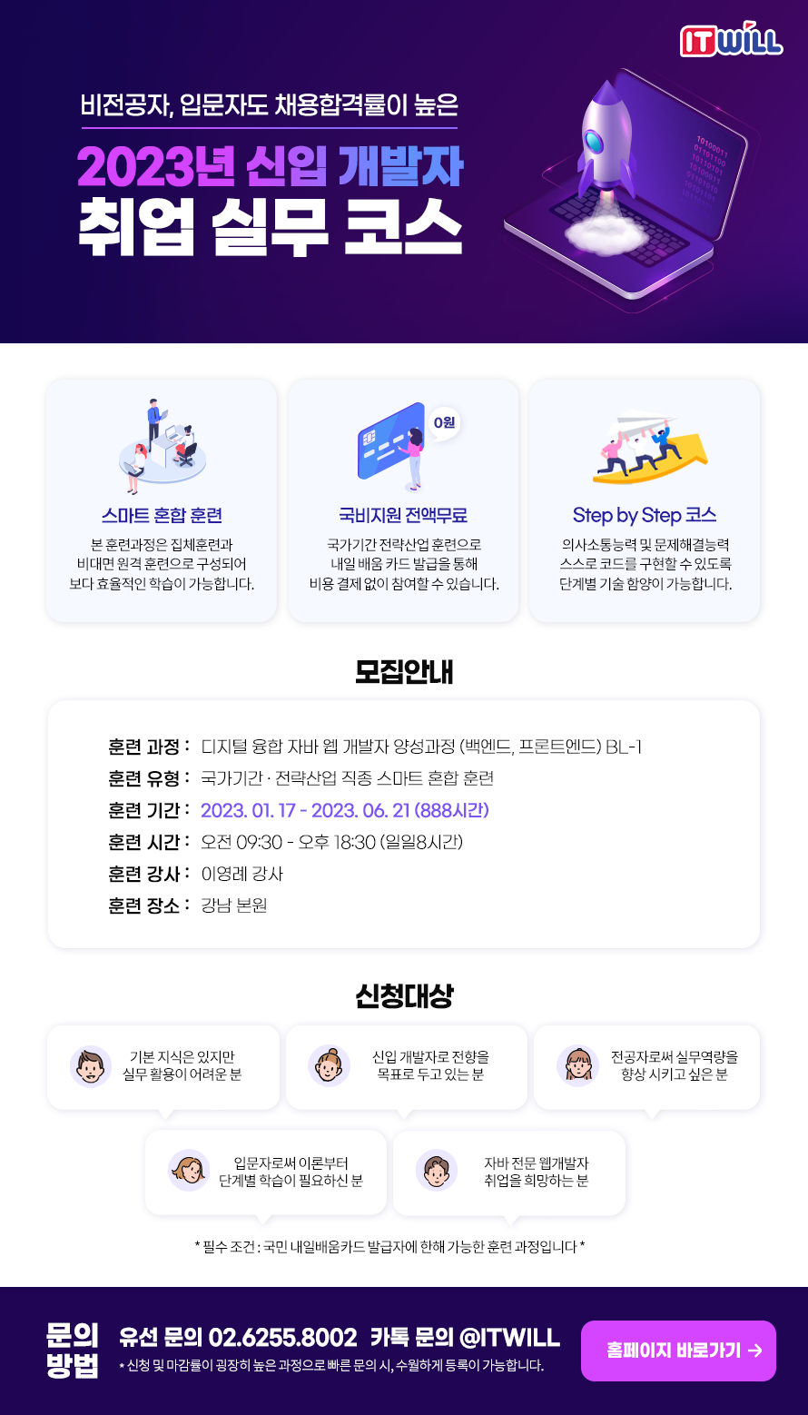 1. 강사님의 교육은 어떤 방식으로 진행되나요? 제 수업은 실습위주의 강의로 진행을 하고 있습니다. 단원개념을 먼저 설명한 후 실습수업시간을 가지며, 수업종료 후에 다양한 퀴즈와 과제를 제시하여 배운내용을 연습해 볼 수 있도록 진행하고 있습니다. 2. 비전공자는 어떻게 지도해주시나요? 학생과 학생, 강사와 학생간의 멘토와 멘티를 지정하여 실력의 상향평준화를 지향합니다. 비전공자를 위해 수업시작 후 전날 배운 내용과 과제의 리뷰시간을 가진 후 본수업을 진행합니다. 비전공자를 위해 강의 단원별 보충강의도 함께 실시할 예정입니다. 때문에 비전공자라도 교육에 꾸준히 참여한다면 충분히 진도에 맞추어 교육을 진행할 수 있습니다. 3. 자바 개발자에게 가장 필요한 스킬은 무엇인가요? 자바 웹 개발자로 취업을 하는 경우 가장 많이 사용하는 프레임워크가 스프링프레임워크 입니다. 그렇기때문에 개발자로 취업을 하기 위해서는 자바와 스프링프레임워크를 반드시 배우셔야 합니다. 정부표준프레임워크로도 사용되고, 국내에서 워낙 자바를 많이 사용하다 보니 스프링은 거의 자바 웹 개발자에게는 필수로 알아야하는 기술입니다. 4. 현업에서 가장 많이 사용되는 기술은 어떤 것이 있으며 본 교육에도 포함이 되어 있나요? 현업에서는 스프링프레임워크를 기반으로하는 스프링부트를 사용합니다. 이 과정에는 스프링부트를 잘 사용할 수 있도록 구성되어 있습니다. 현업에서 사용하는 협업도구인 Github를 프로젝트와 수업전반에 걸쳐 사용하며 익숙해질 수 있도록 구성되어 있습니다. 5. 프로젝트는 어떤 방식으로 진행되나요? 프로젝트는 교육이간 중 총 3번 진행됩니다. 두 번의 세미프로젝트와 한 번의 파이널 프로젝트를 통하여 실무능력을 배양합니다. 첫번째 프로젝트는 개인별 프로젝트로 진행하고 두번째와 세번째 프로젝트는 팀별로 진행합니다. 프로젝트 수행시 프로젝트 표준산출물을 작성하여 개인별 혹은 팀별 포트폴리오를 제작하게 되며 이 결과물은 취업시 본인이 가지고 있는 스킬을 표현할 수 있는 자료가 됩니다. 6. 교육을 시작하기 전에 필요한 것이 있나요? 기본적으로 영문 타자연습은 필수입니다. 키보드만 보고 타자를 치다보면 어느새 화면은 다음으로 넘어가있습니다. 때문에 영문타자는 기본이라고 할 수 있습니다. 다음으로 필요한 것이 인내와 꾸준함 입니다. 6개월이라는 장기간 교육이기 때문에 굳은 마음가짐이 필요합니다. 개발자로 취업하겠다는 의지를 가지고 교육에 참여해주시기 바랍니다. 7. 본 교육에 참여하는 학생들에게 전해주고 싶은 말이 있다면 어떤 것이 있나요? '나는 유별나게 머리가똑똑하지않다! 특별히 지혜가 많은것도 아니다! 다만 나는 변화하고자 하는 마음을 생각으로 옮겼을뿐이다.' 라고 빌 게이츠가 말했습니다. 열정과 의지만 가지고 오십시오! 그리고 저만 믿고 따라오십시오!