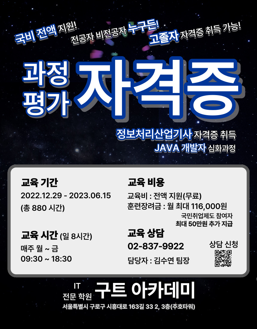 비전공자도 구트아카데미와 함께 라면 나도 될 수 있다 개발자!!! 기초부터 꼼꼼히, 백앤드 개발자가 되기 위한 전반적인 핵심 기술을 정확하게 배움과 동시에 취업에 필요한 '정보처리산업기사' 자격증까지 동시에 취득 가능한 취업 맞춤형 무료교육과정!!