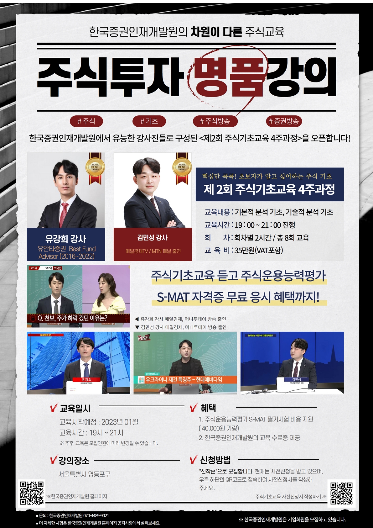 핵심만 콕콕 집어서 배우자! 주식 초보자들이 알고 싶어 하는 주식 기초!! 수료 후에는 4만원 상당의 주식운용능력평가(S-MAT) 필기시험 응시 혜택까지!! 한국증권인재개발원에서 유능한 강사진들로 구성된 주식 기초교육 4주 과정 온/오프라인 교육과정이 오픈 예정입니다. 수강인원을 파악하기 위해 사전모집을 진행합니다. [참가대상] 주식 기초교육을 받고자 하는 누구나. [참가방법] https://docs.google.com/forms/d/16BxonZ3JttL95yBvqugNNV7_iOzuVII6bfgLNt9p4wU/edit 상단 링크 클릭 후 사전신청 양식 작성 [모집기간] \~2023.01.15 [모집 정원] 20명\~30명 [교육비] 35만원(VAT포함) [교육내용] 기본적 분석 기초, 기술적 분석 기초 [교육장소] 서울특별시 영등포구 ※ 교육 장소는 추후 모집인원에 따라 변동될 수 있습니다. [교육기간] 2023년 01월 중 시행 (주 2회 / 4주) [교육시간] 19시 \~ 21시 회차 별 2시간 / 총 8회, 16시간 교육 [커리큘럼 및 상세내용] 한국증권인재개발원 홈페이지 참조 [교육혜택] 과정 종료 후 수료증 지급 주식운용능력평가 S-MAT 필기시험 응시료 전액 환급지원 (23년 첫 시험 한정) [교육과정 문의] 한국증권인재개발원 카카오톡플러스친구 또는 070-4489-9021 문의 카카오톡플러스친구채널 추가하기 → https://pf.kakao.com/_xmTxbiT/chat * 자세한 사항은 아래 홈페이지를 참고 바랍니다. 한국증권인재개발원 https://smat.kr ** 교육과정 상세내용은 변경될 수 있습니다.
