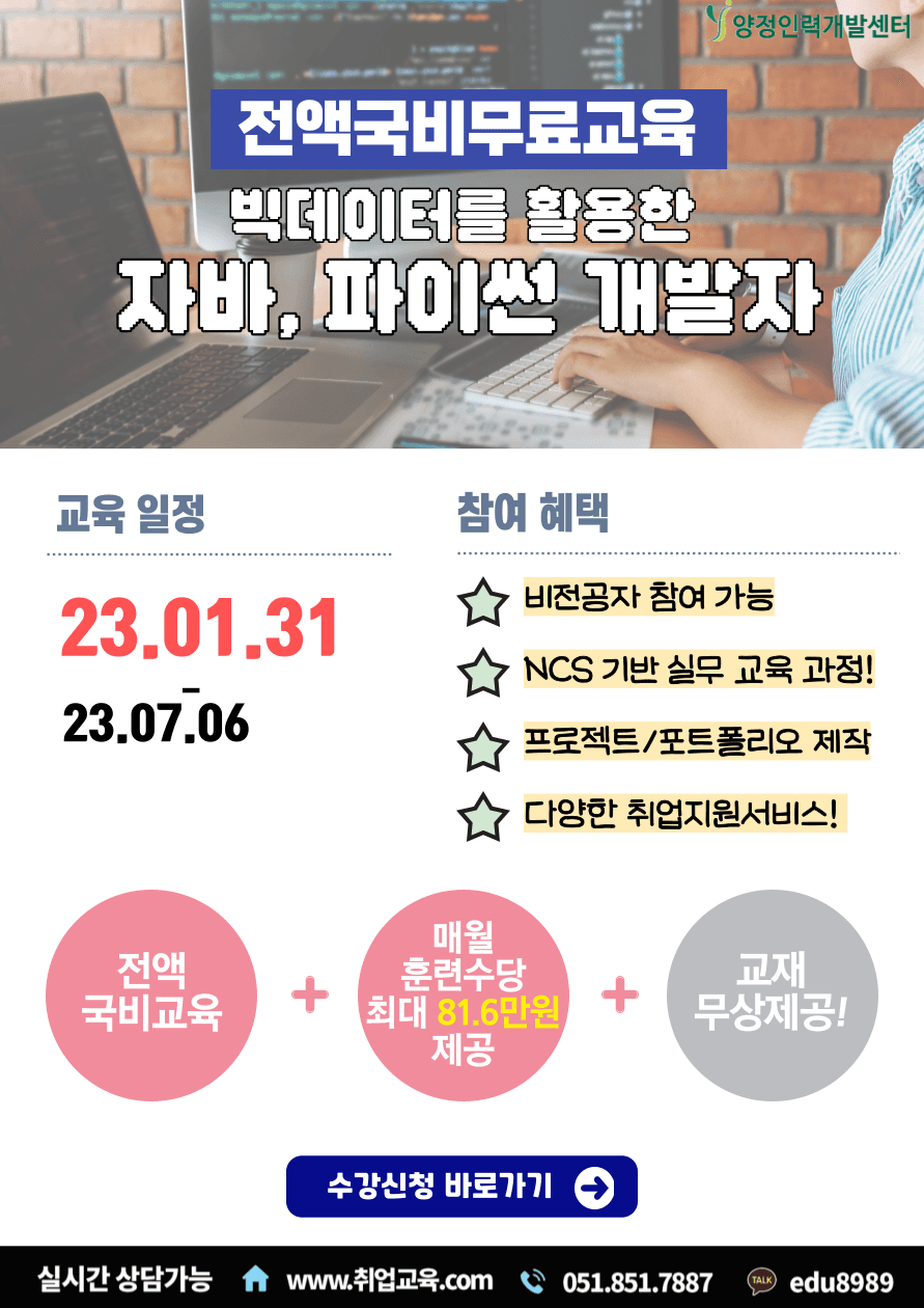 ♣ 교육문의 및 수강 신청은 양정인력개발센터 홈페이지(https://www.jobyj.co.kr/) 수강신청 또는 051-851-7887 유선 연락해주세요^^