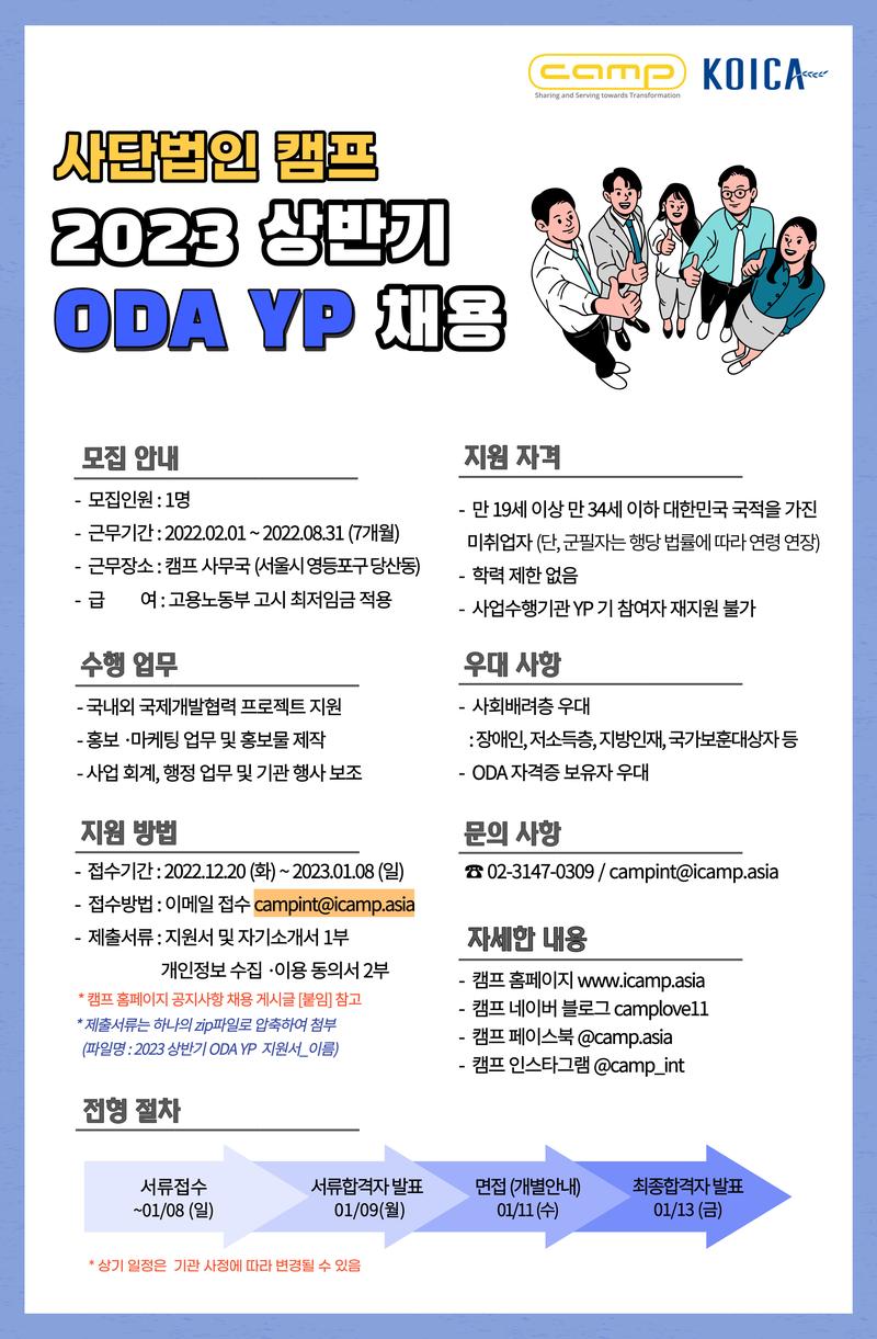 사단법인 캠프와 함께 할 ODA 영프로페셔널(ODA YP)을 모집하오니 많은 관심과 지원 바랍니다.