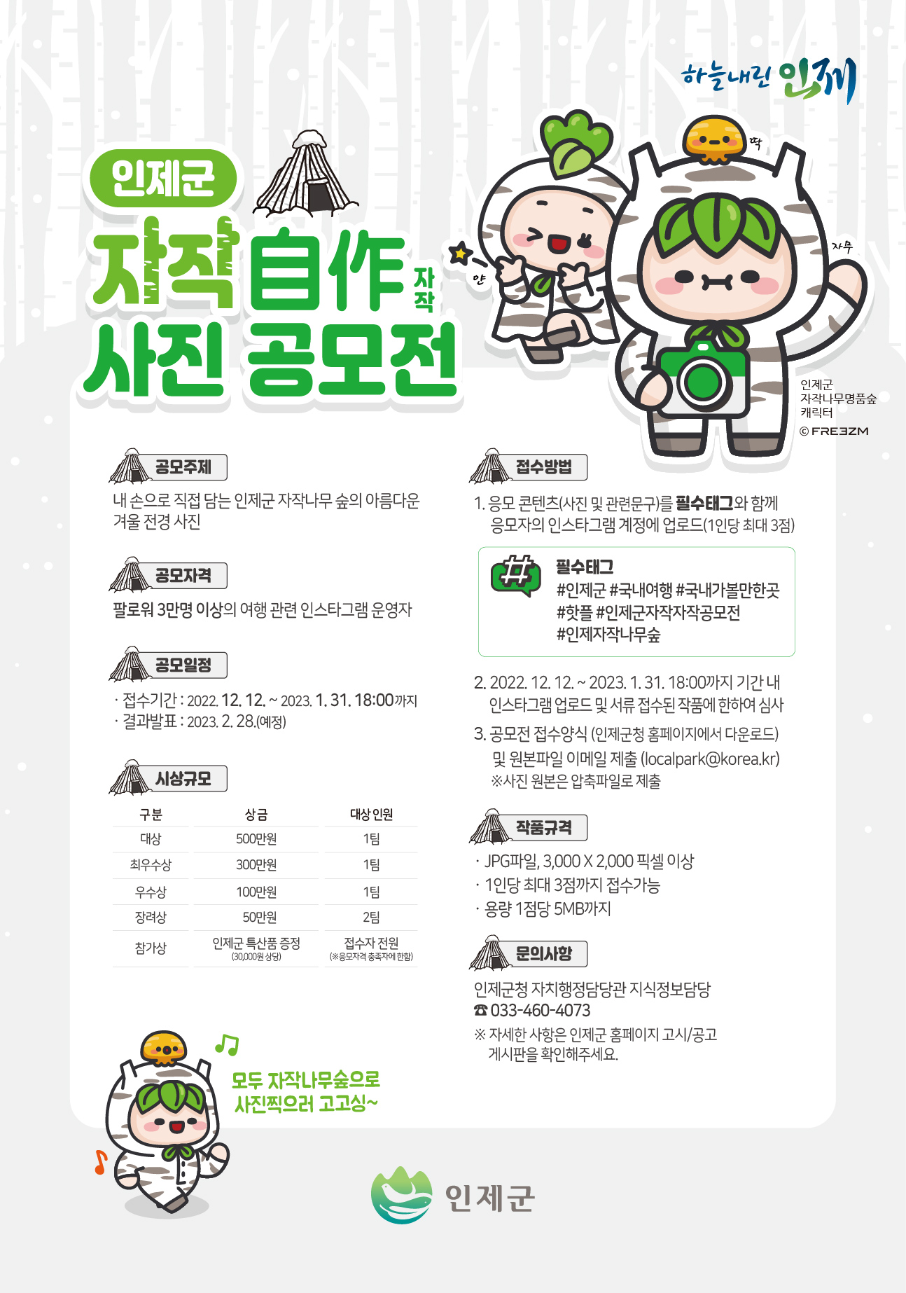 - 참가상 : 접수자 전원(응모자격 충족자에 한함) 인제군 특산품 증정