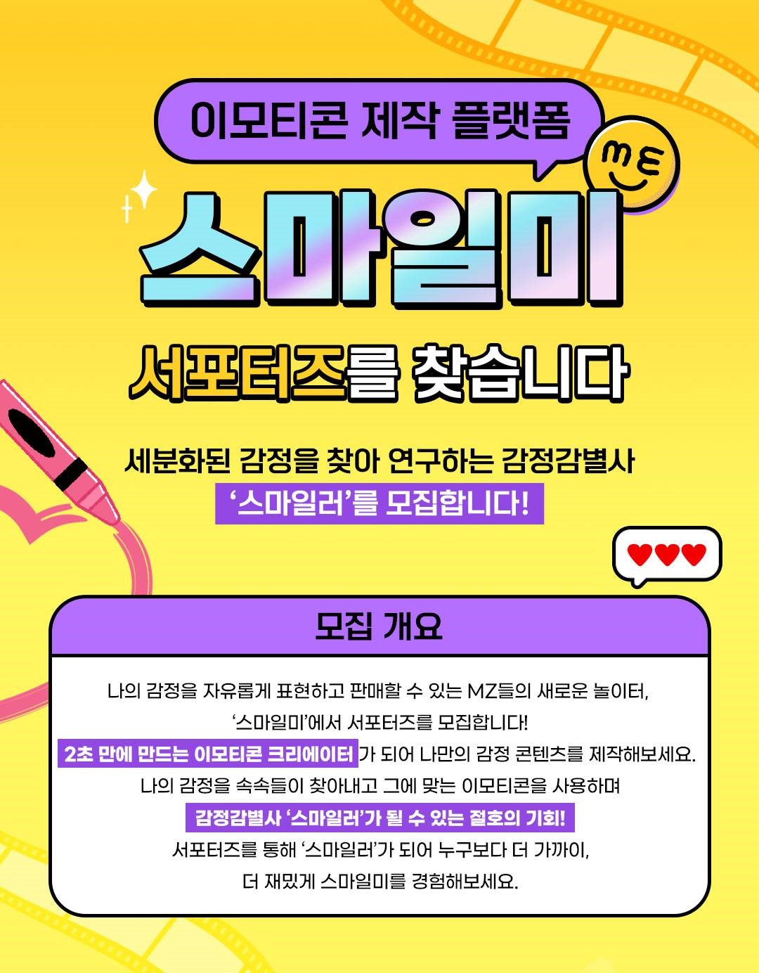 서포터즈를 통해 감정 감별사 💛스마일러💛가 되어 다양한 콘텐츠를 만들고 스마일미를 소문 내주세요.