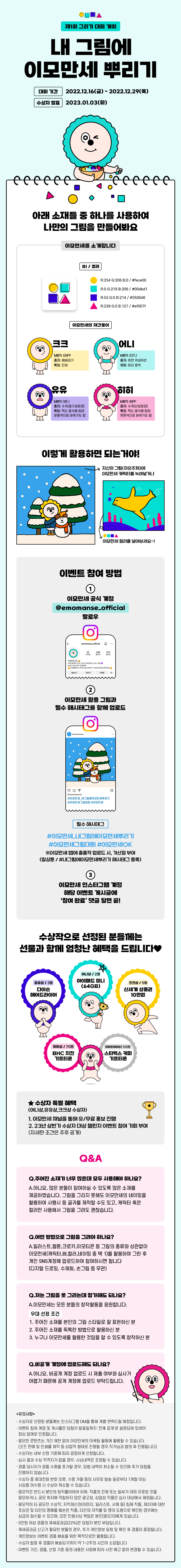 ※ 응모한 콘텐츠는 기간 제한 없이 이모만세의 마케팅활동에 활용될 수 있습니다.(굿즈 판매 및 인쇄물 제작 등 상업적 형태로 진행될 경우, 작가님과 협의 후 진행됩니다.)