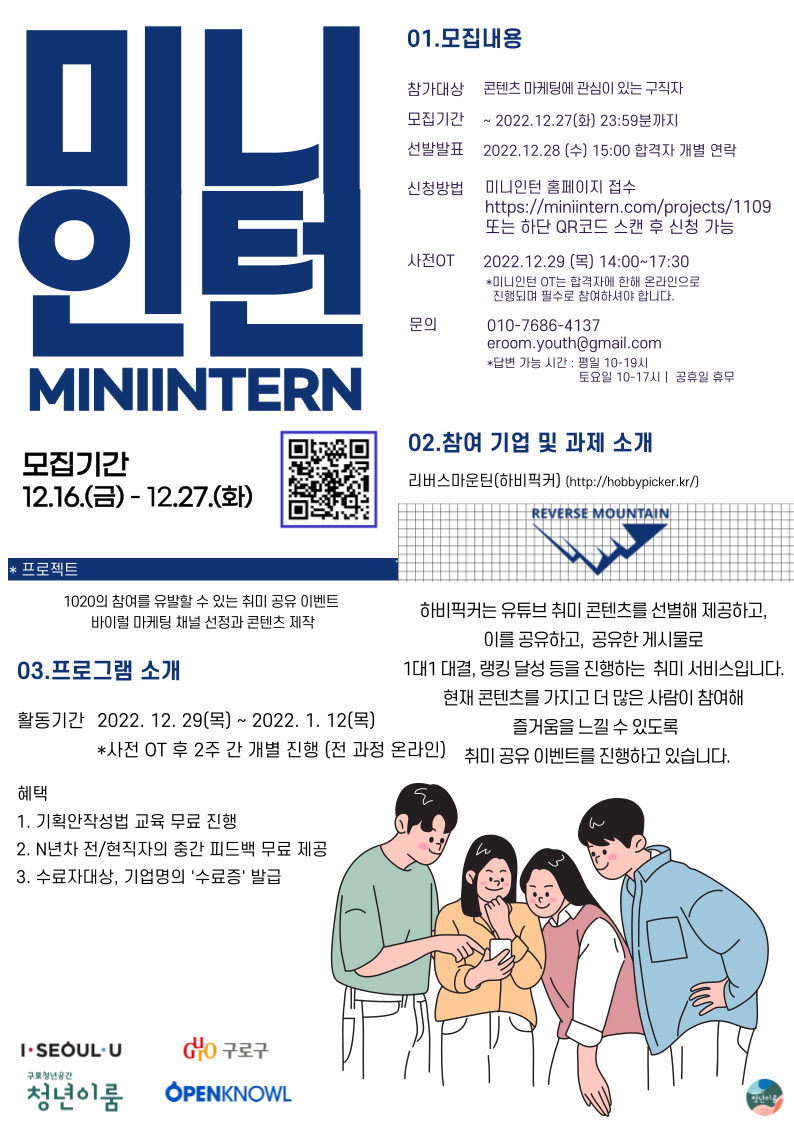 ▶ 지원 방법 미니인턴 홈페이지에서 온라인 접수 바로가기 : https://miniintern.com/projects/1109