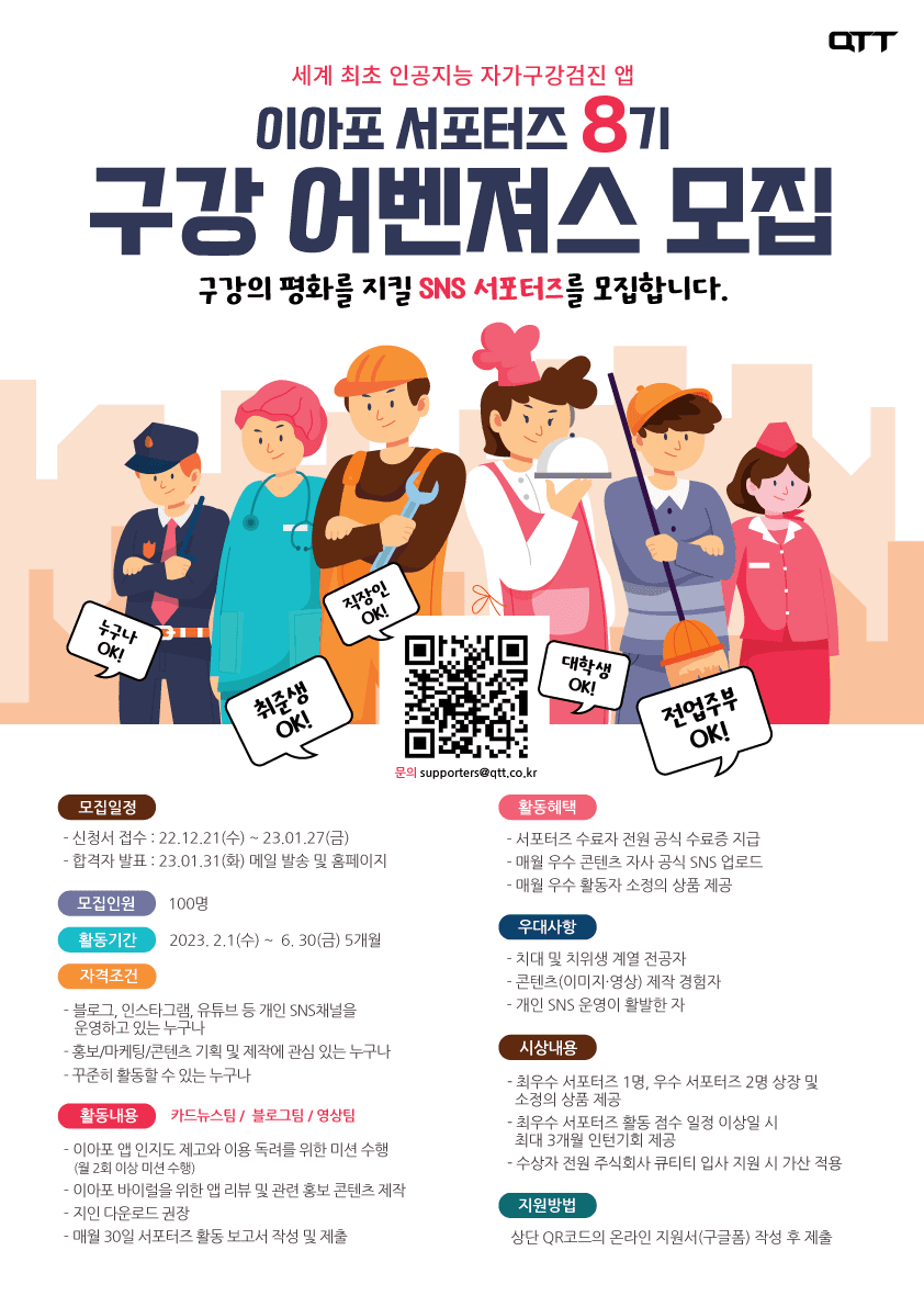 집에서 하는 셀프 자가구강관리앱 이아포(e.apo) 홍보를 위한 제 8기 이아포 공식 서포터즈를 모집합니다. 떠오르는 벤처기업 큐티티에서 기업의 홍보 활동을 체험하고 취업 및 진로 탐색을 위한 다양한 프로그램과 인턴쉽 기회까지 얻을 수 있는 기회! 창의력과 열정을 가진 분들의 많은 지원 바랍니다.