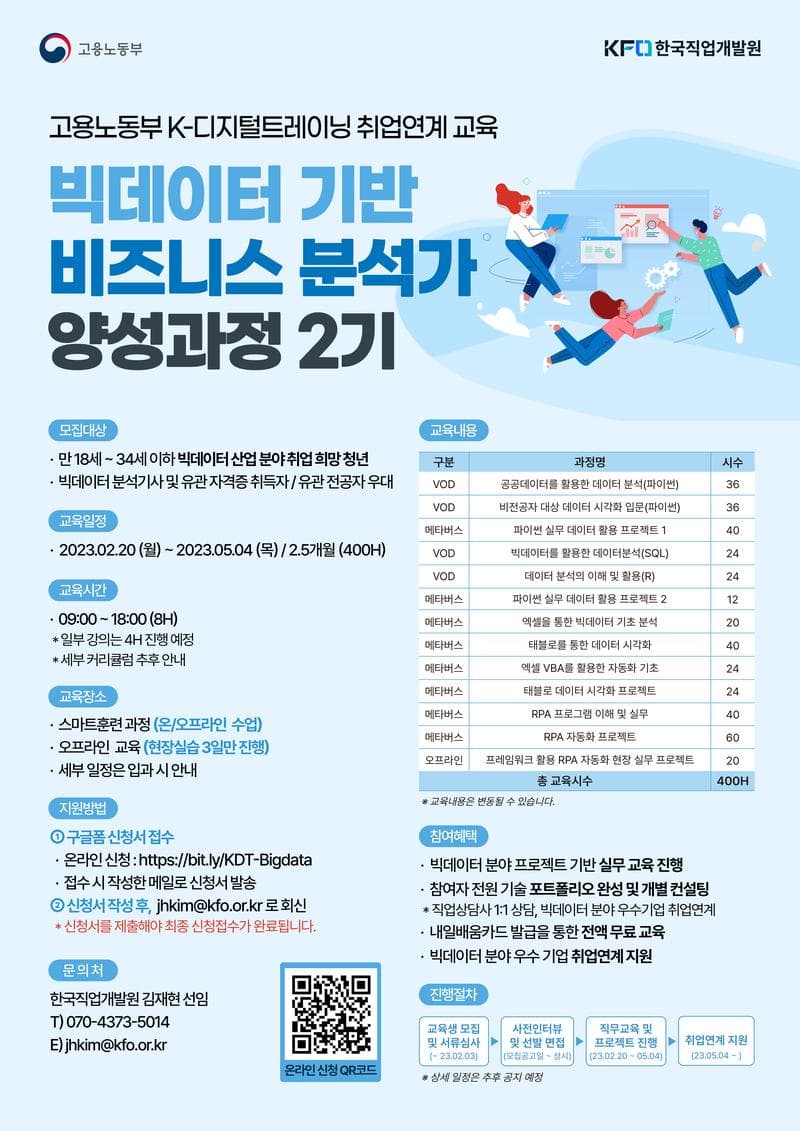 ● 교육일정 - 23.02.20 \~ 23.05.04 (2.5개월, 400시간) - 주 5일 (평일) 9:00 \~ 18:00 (8시간) - 온/오프라인 과정 ※ 오프라인 현장실습 참여 필수