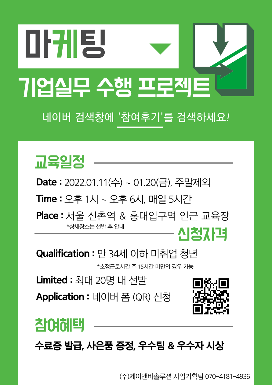 💁 기타 ∨ 신청 기간 : \~ 1/10(화) 14:00 까지 ※ 모집인원 완료시 조기마감 될 수 있음 ∨ 참여효과 - 고용노동부 주관 수료증 발급 - 마케팅 TEAM 프로젝트 포폴 완성 - 수료자 전원 사은품 증정 - 우수 TEAM\, 참여자 선발 및 상품 증정 ※ 선발자 한해 '카카오톡 오픈채팅방' 링크를 문자로 개별 안내 ※ 전액 국비지원 무료혜택, 오프라인 현장 교육 진행 ※ 교육후기는 네이버에서 “마케팅 기업실무 수행 프로젝트” 검색 ※ 문의사항은 전화 또는 오픈채팅방으로 주세요 :) ★ 문의 오픈 채팅방 : https://open.kakao.com/o/sqAJxlGe