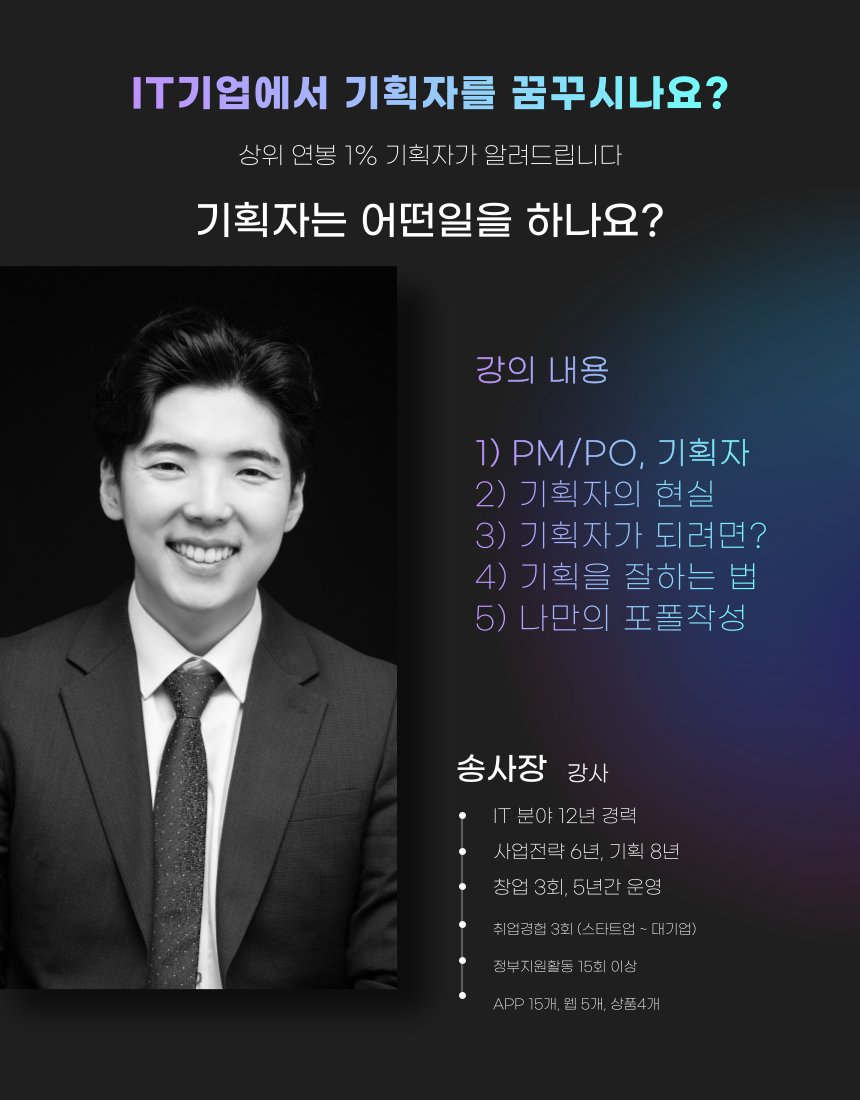상위 연봉 1%의 기획자가 기획직군을 소개합니다. 연말 매우 중요한 꿀팁을 얻으셔서 내년엔 꼭! 좋은곳으로 취업하시기를 희망합니다. 1. 강연일시 : 12월 30일 14:00 (40분 소요 예정) 2. 강연내용 : 현업의 기획자가 여러분께 기획자를 소개합니다. 3. 신청기간 : 12월 21일 \~ 12월 29일 4. 신청인원 : 100명 5. 강연진행 : 메타버스에서 진행 예정 6. 신청링크 : https://forms.gle/VY1UGXExG3Q4tT2L7 7. 강연비 : 무료