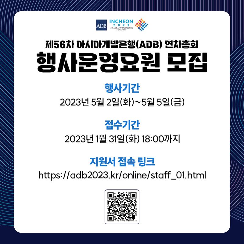 아시아 · 태평양 지역 국가 간의 상호이해와 경제협력이 발전하는 계기가 될 ‘제56차 아시아개발은행 연차총회’가 2023년 5월 2일(화)부터 5월 5일(금)까지 인천 송도컨벤시아에서 진행됩니다. 연차총회의 성공적인 개최를 위하여 아래와 같이 운영요원을 모집하오니 여러분들의 많은 관심과 지원 바랍니다.