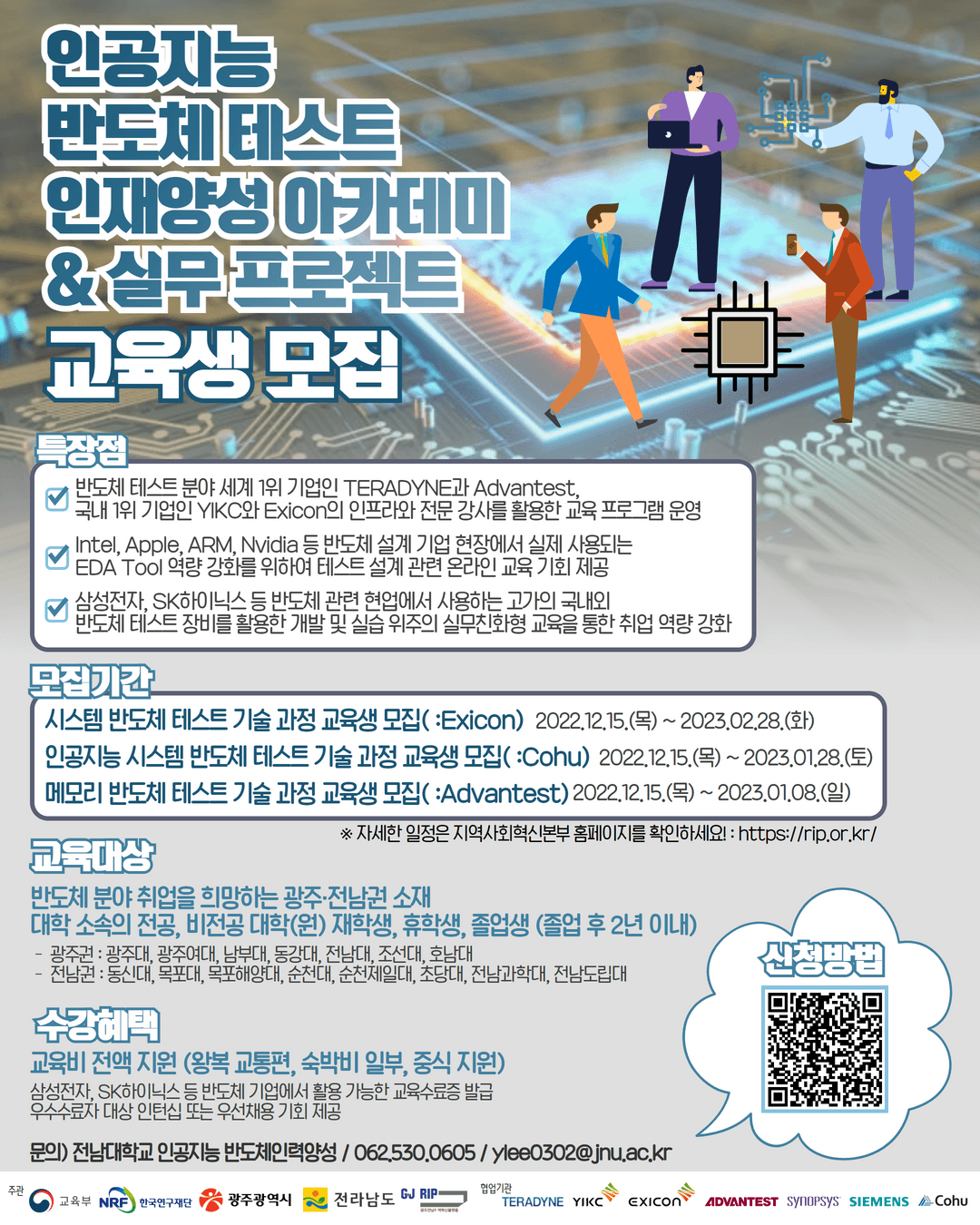 지역사회혁신본부와 전남대학교 반도체개발지능화센터에서 ✅인공지능 반도체 테스트 특화 전문인력 양성을 위하여 [반도체 테스트 기술 과정 교육] 에 참여할 학생을 모집합니다.