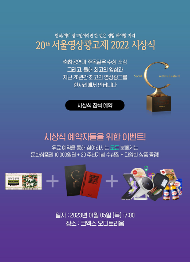 [서울영상광고제 2022 시상식] ▶ 일 시: 2023년 1월 5일 (목) 17:00 ▶ 장 소: 코엑스 오디토리움 ▶ 사전접수: 서울영상광고제 사이트 https://www.tvcf.co.kr/TvcfAward/Main/default.asp