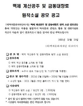 백제 계산공주 및 금동대향로를 소재로 하는 창작 소설 공모를 통해 역량있는 작품을 발굴하여, 백제문화 콘텐츠 활용 및 관광 자원화를 위해 아래와 같이 백제 계산공주 및 금동대향로 원작 소설 공모전을 개최하오니 많은 참여 바랍니다.