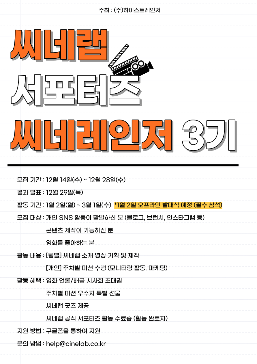 안녕하세요. (주)하이스트레인저 씨네랩 담당자입니다. 영화/OTT 온라인 웹 매거진 씨네랩에서 씨네랩 서포터즈 3기를 모집합니다.