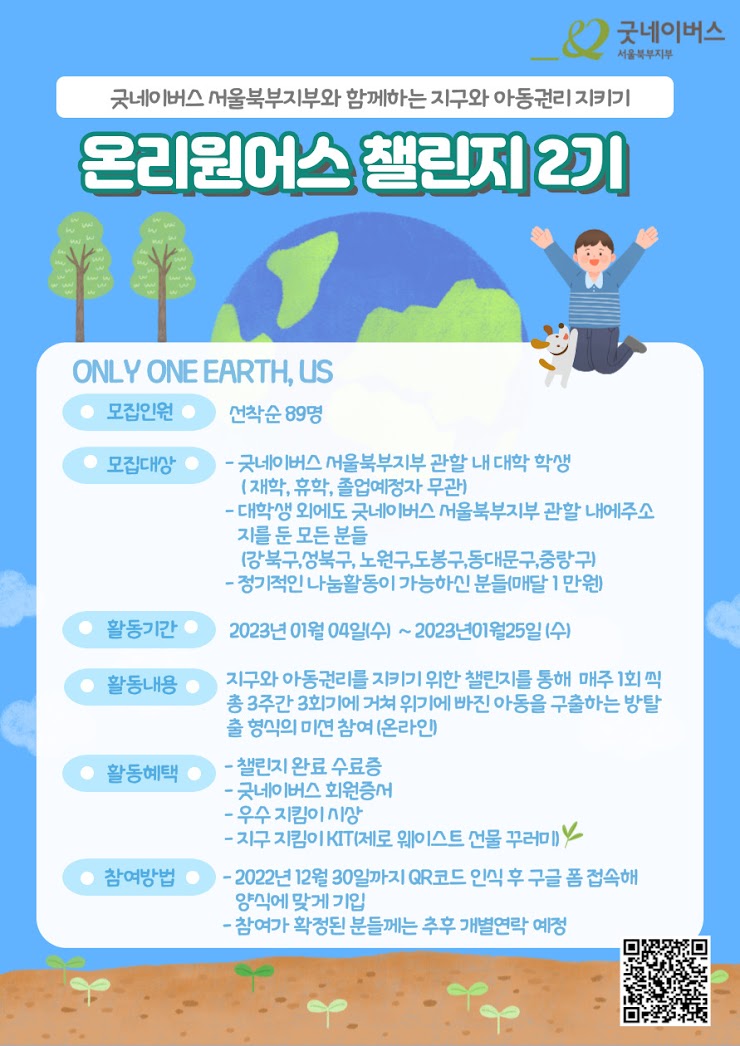 🌏지구와 아동권리를 지키기 위한 도전은 계속된다👊🏻다.시 돌아온 온리원어스 🚨온리원어스2기에 참여할 챌린저 구함\~\~ 굿네이버스 서울북부지부에서 지구와 아동권리를 지킬 준비가 된 지구 지킴이89명을 모집합니다! 1989년도에 ‘UN아동권리협약’이 만장일치로 채택되었습니다🌷 의미깊은 89라는 숫자처럼 89명의 지구와 아동권리를 함께 지키는 지킴이를 모집하고 있습니다!