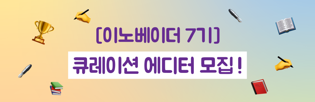 🙌 [이노베이더 7기] 큐레이션 에디터 지원 📩 https://forms.gle/wEFMjjPzgbG7SGqU8 (* 활동그룹 ▷ ‘큐레이션 에디터’ 체크해 주세요! ✅) ⠀