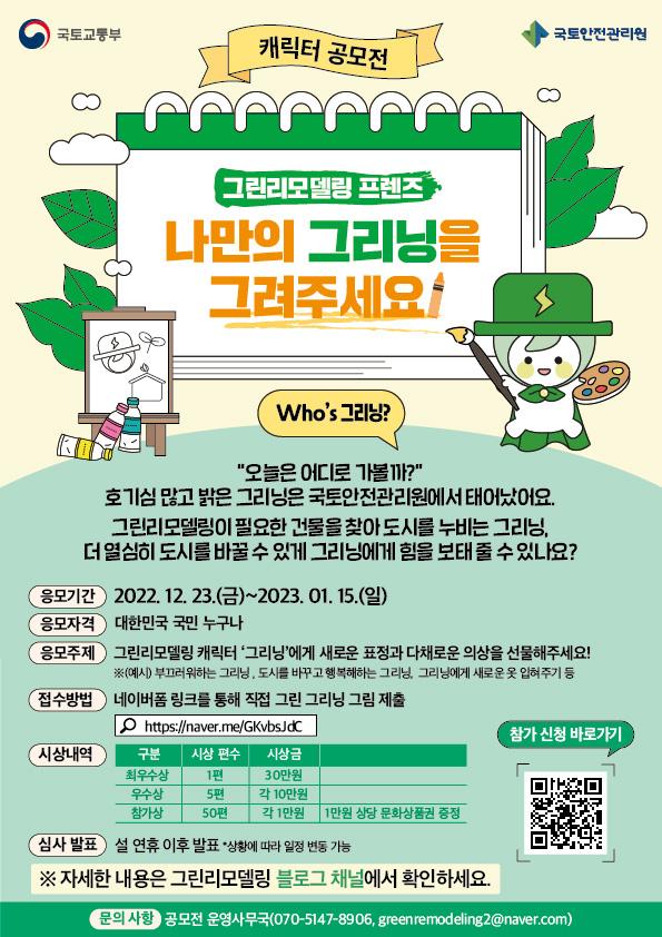 ● 응모주제 그린리모델링 캐릭터 '그리닝'에게 새로운 표정과 다채로운 의상을 선물해주세요! ※(예시) 부끄러워하는 그리닝, 도시를 바꾸고 행복해하는 그리닝, 그리닝에게 새로운 옷 입혀주기 등